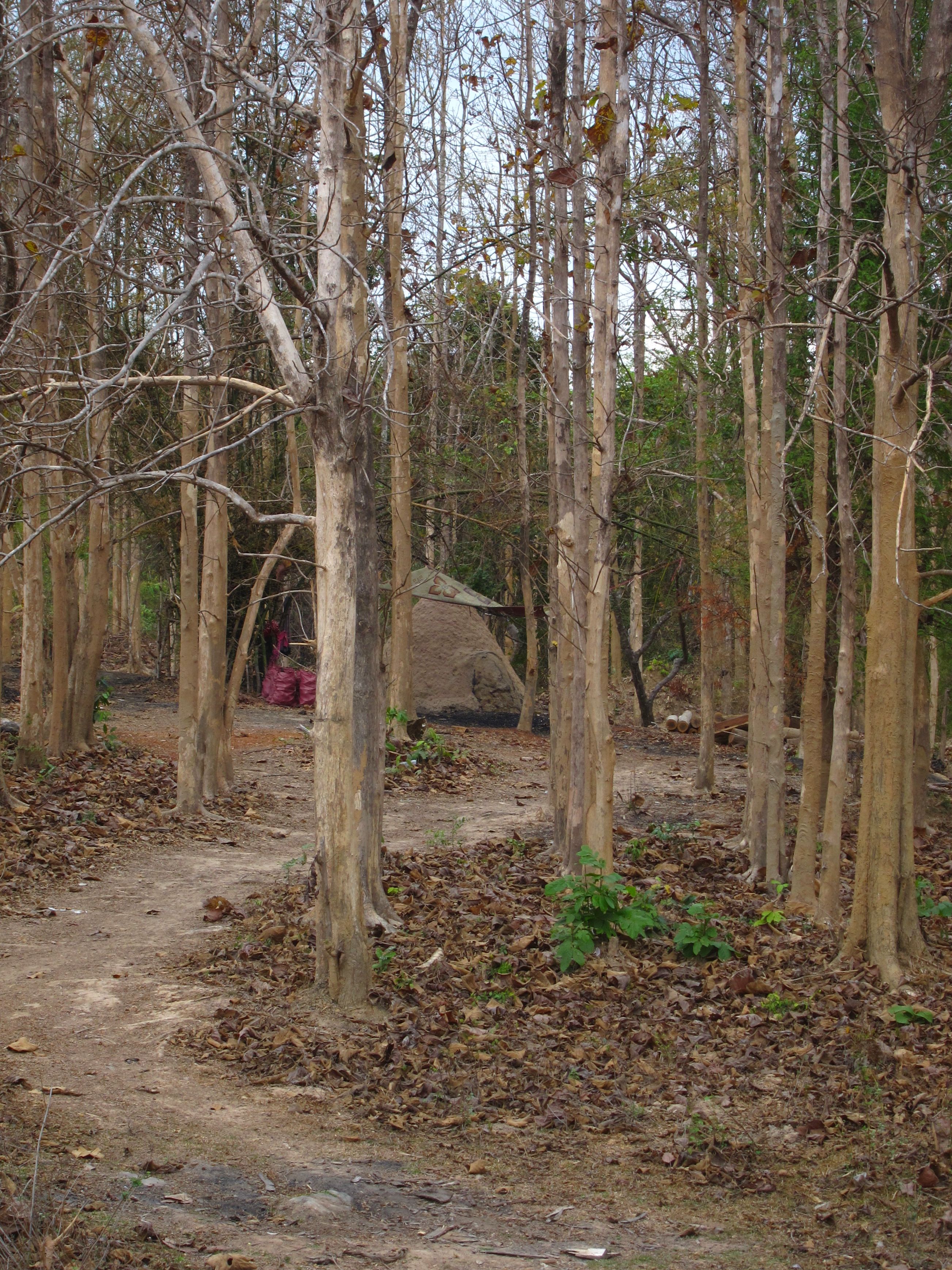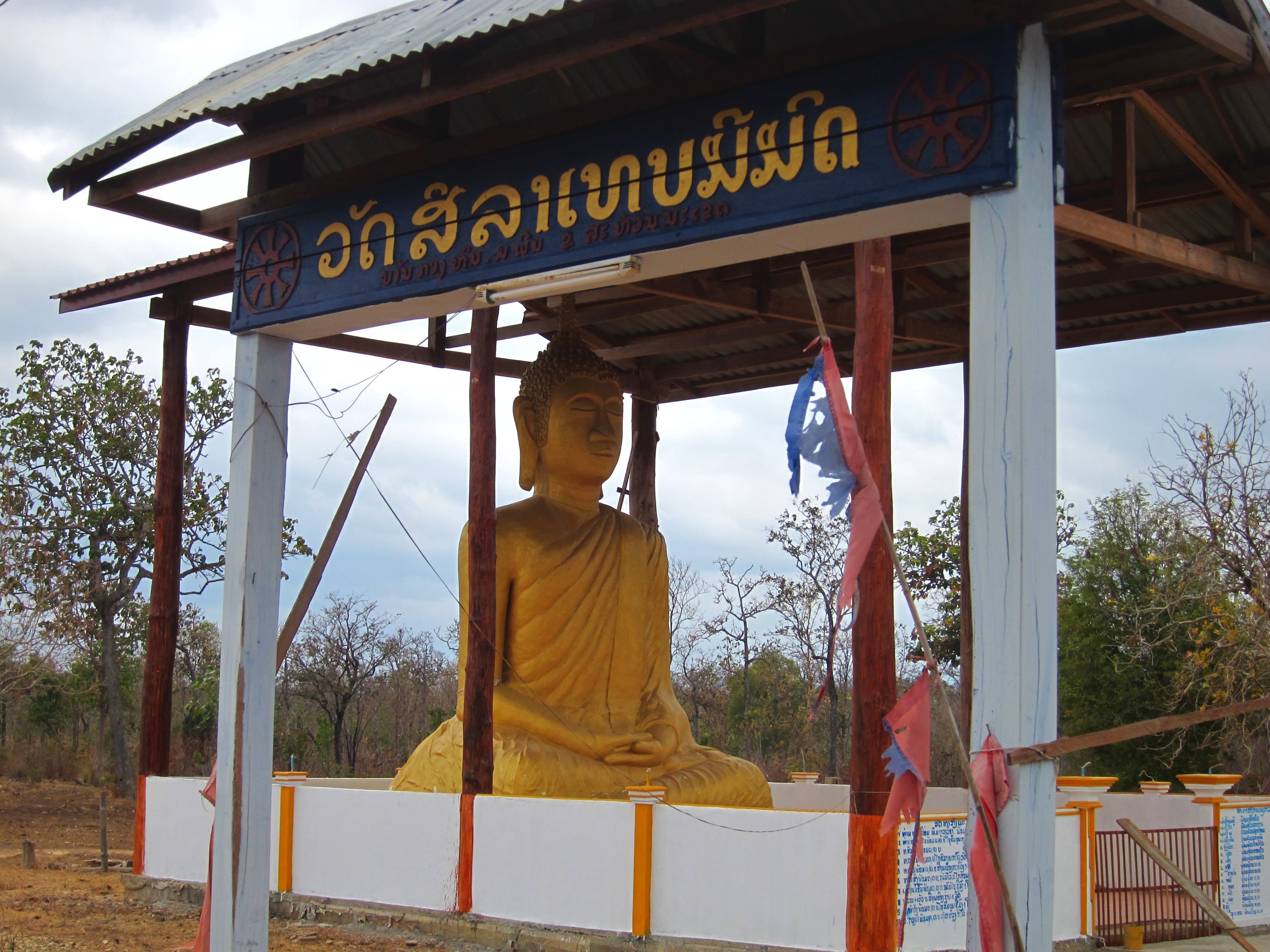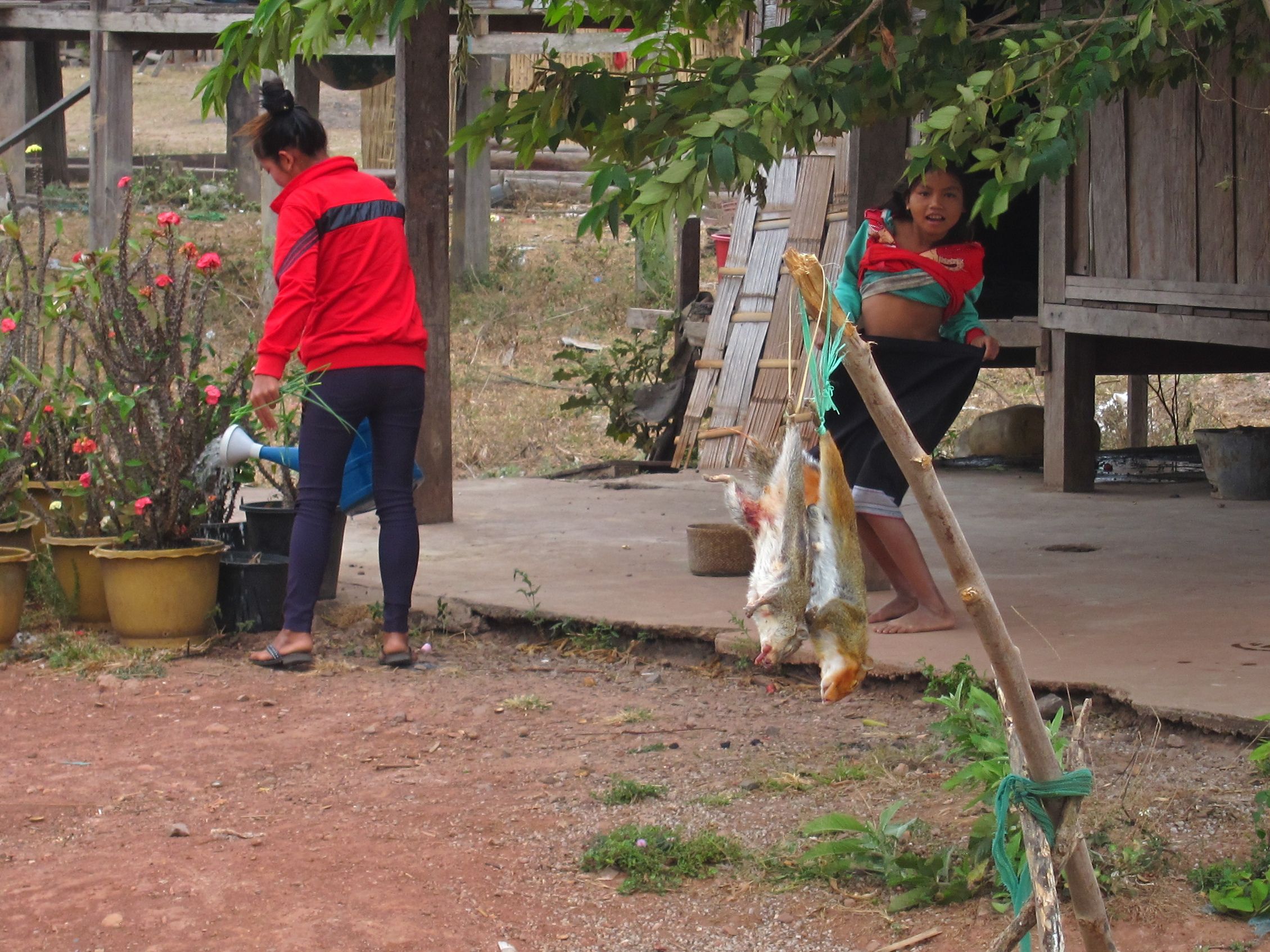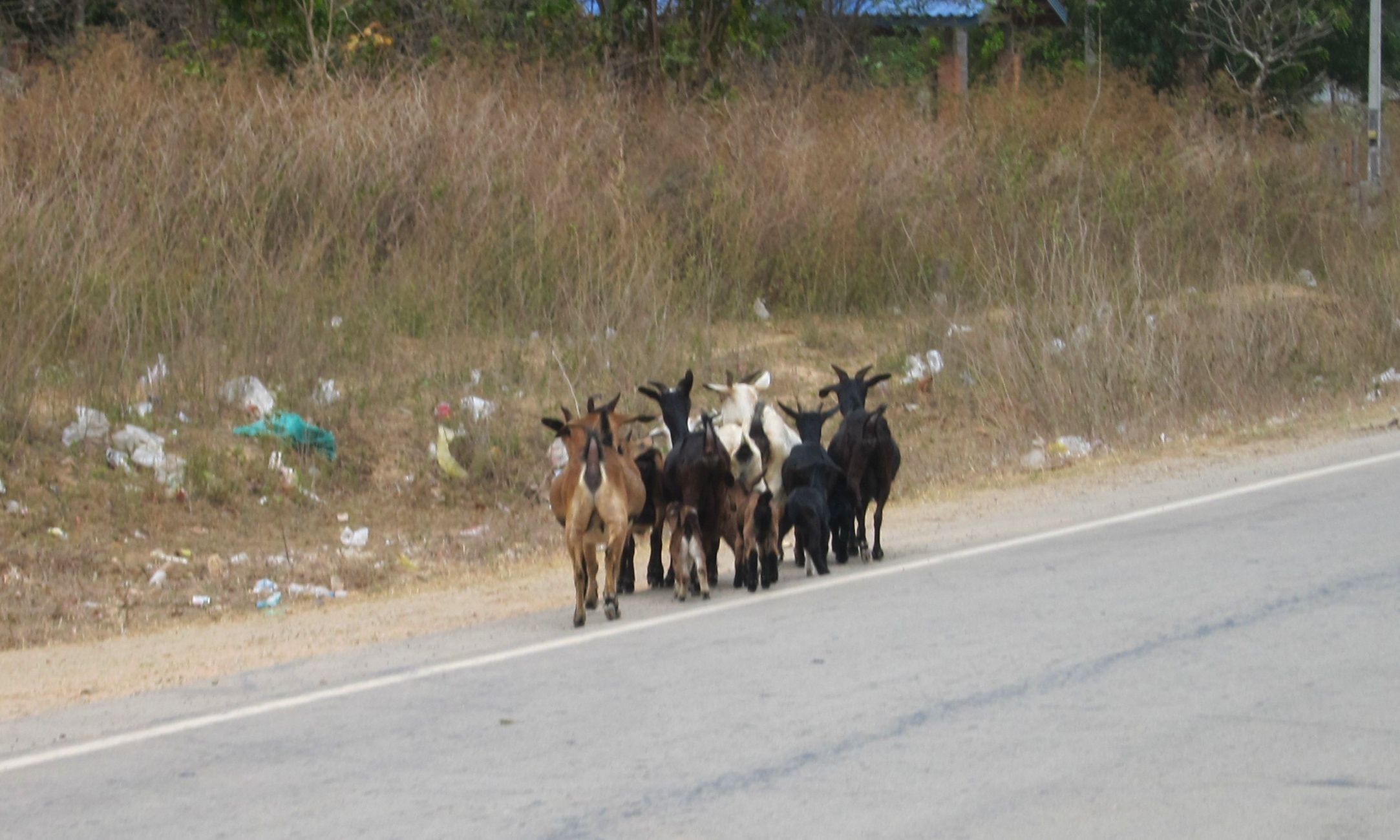 The ride was easy going, rolling hills with a tailwind. We were flying down and up every hill. The scenery was not as lush as Vietnam, but still mountainous and beautiful. Children and adults called out to say “Sabaidee” to us in each small village we passed. Laos is the first country that people mostly greet us in their own language, not in English. It is surprisingly refreshing. We saw lots of goats and pigs wandering on the side of the road and sometimes in the road. We passed through a village where everyone seemed to be making charcoal. Tractors piled with wood that smelled like cedar frequently passed us, delivering their loads to the villagers. We saw piles of smoldering sand where they had buried the burning wood slowly transforming it into charcoal. Villagers with black hands raked the sand away from the finished piles, and extracted the blackened remnants of the wood. The charcoal towns were full of dense sooty smog and were not all that pleasant for riding.