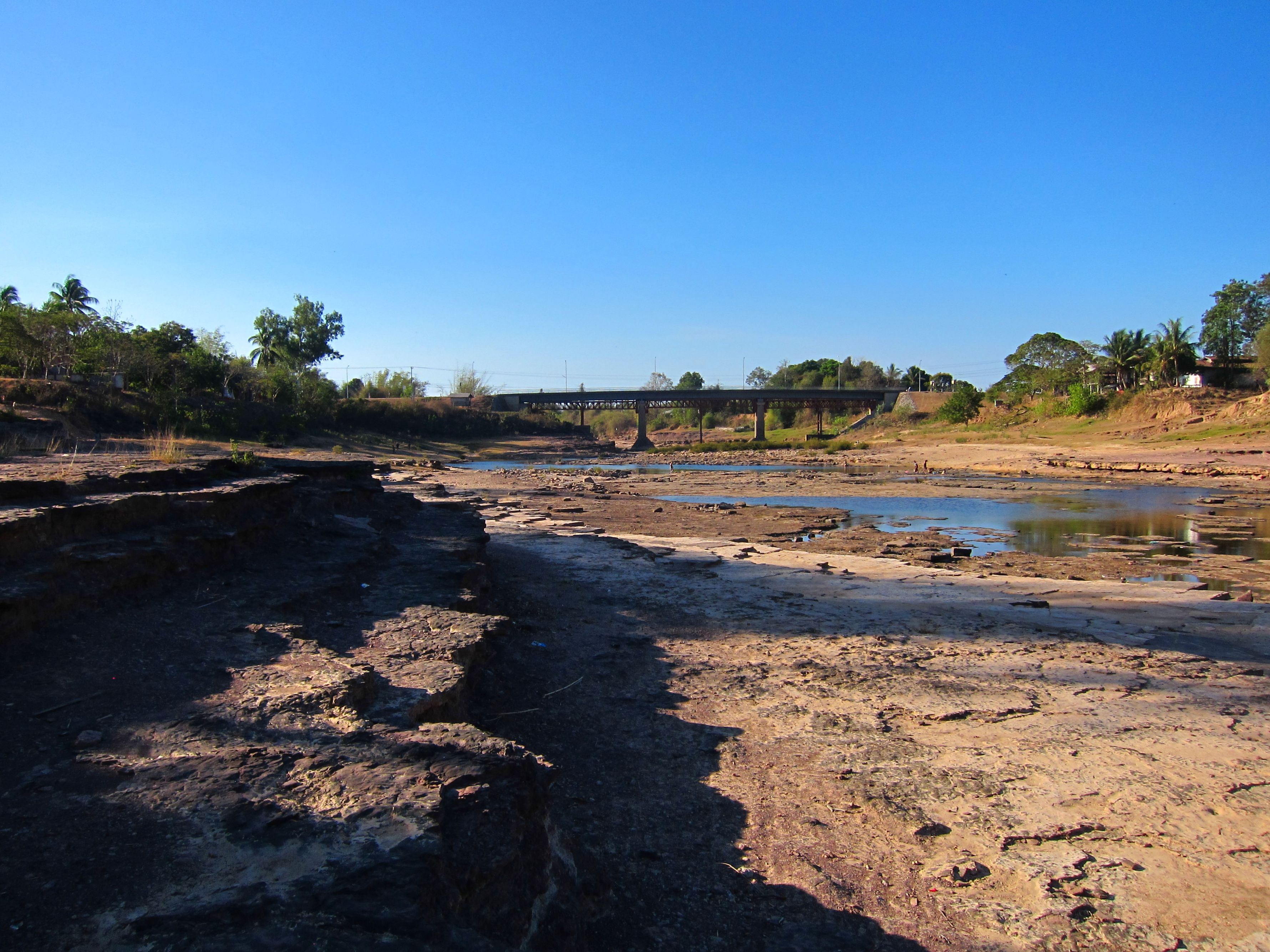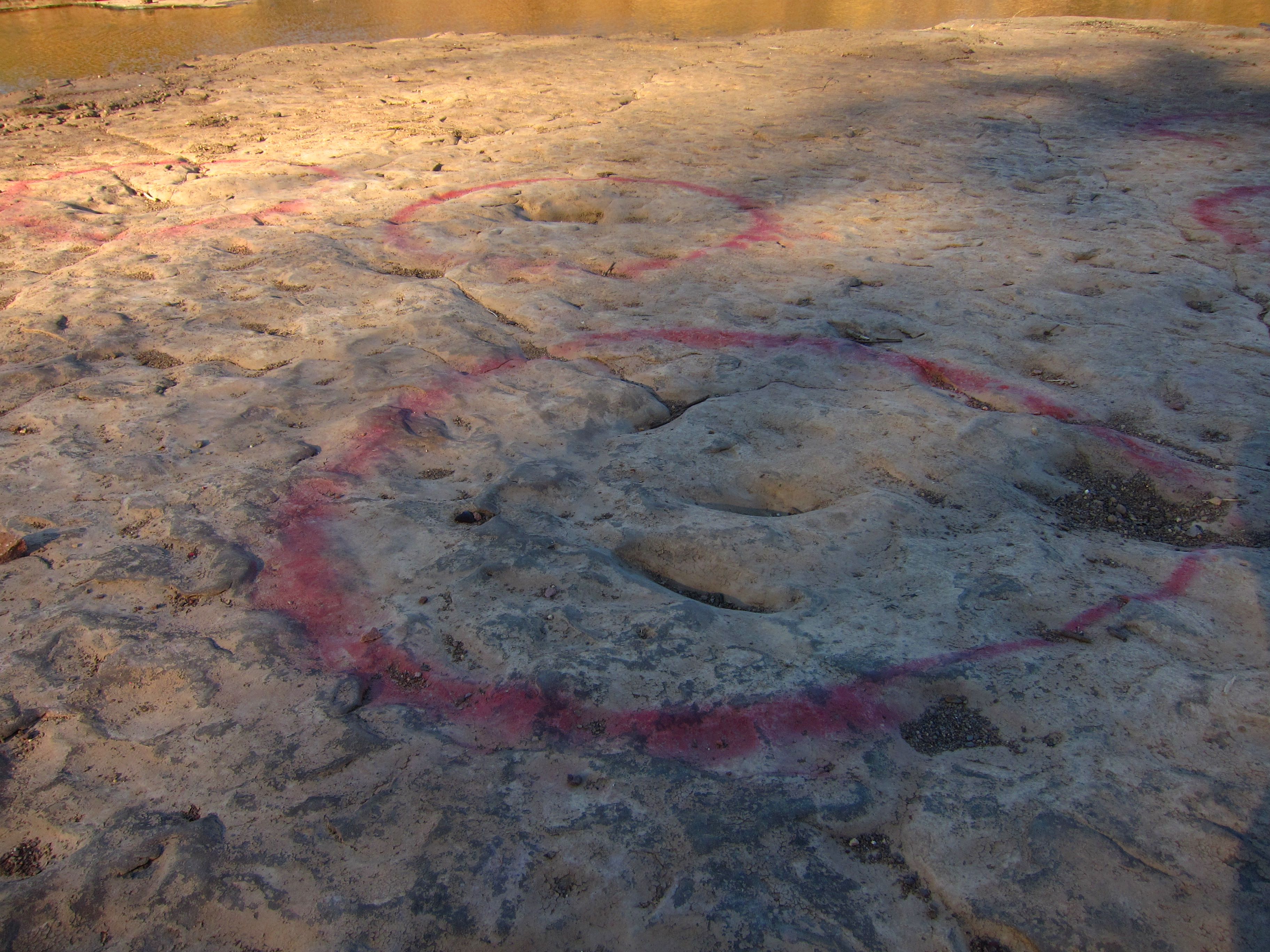 Soon enough we came upon a road sign pointing out a nearby attraction, dinosaur footprints. We followed the arrow off onto dirt road that led us to the river where a number of people were bathing. It wasn’t clear where we were supposed to go, but a friendly man clearly realized why two goofy looking white folks were wandered down his road and pointed up the river. We took turns staying with the bikes while the other went to look at the prints. Someone had spray painted red circles around the prints, otherwise I never would have noticed them. But upon further inspections, it was clear that they were in fact footprints of some sort. Chandler assumed they were velosaraptors, but most of his paleontological knowledge is from multiple viewings of Jurassic Park (AND he read the book), but there wasn’t any information on display, so who knows what made the prints.
