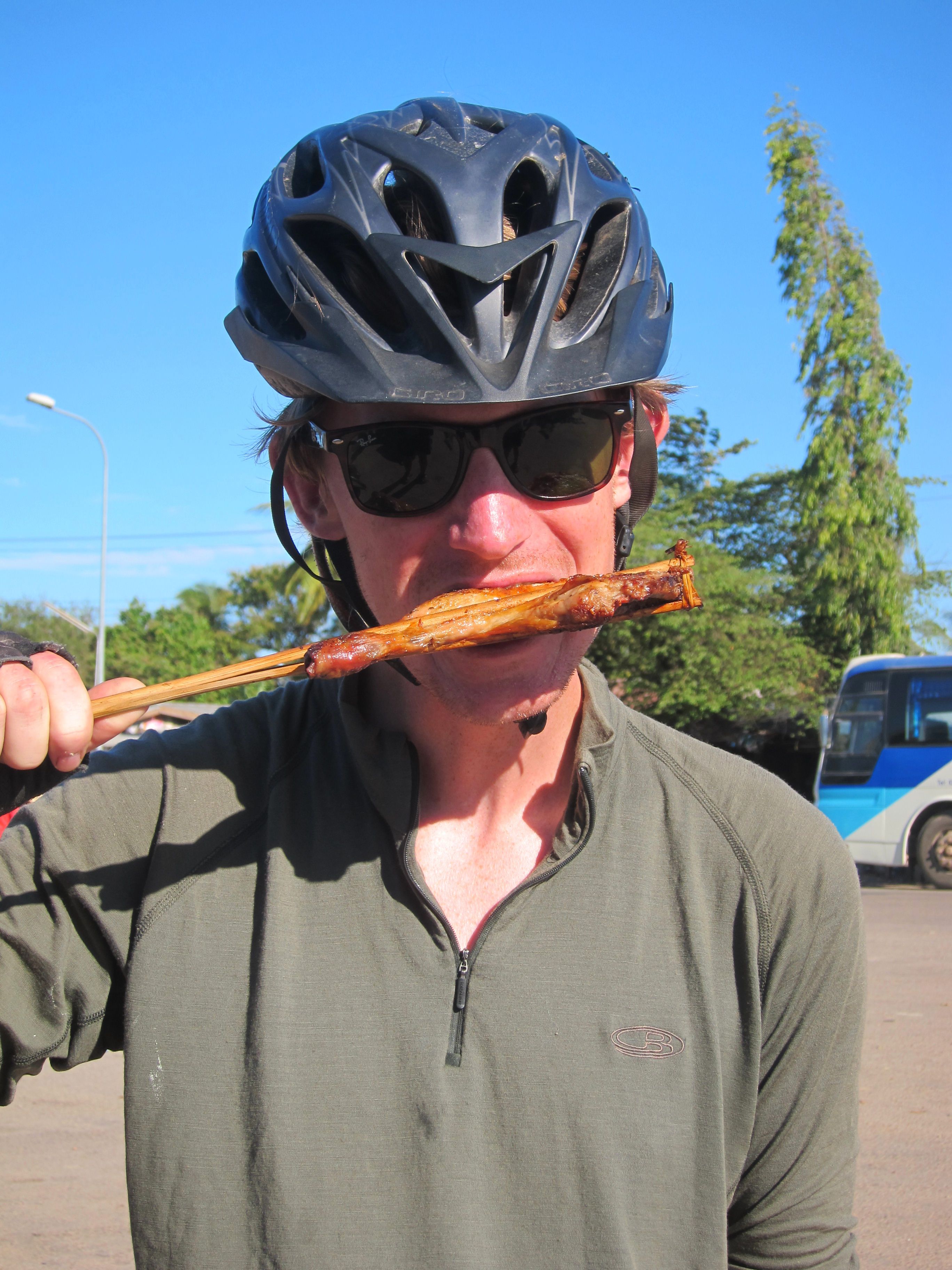 We already knew that we wouldn’t find breakfast in this weird little town so we starting riding right away. Chandler was already hungry (he is usually hungry, or almost hungry) so we stopped at a mini-bus station a few kilometers down the road and he finally got some meat on a stick, which is so common throughout SE Asia. This was a whole chicken leg BBQ’d and tied to a stick. He passed on the skewered BBQ beetles, though they were a steal at 5000 kip ($0.60) for a baker’s dozen of them. Chandler gave the chicken a thumbs up while munching away at it as he rode along. We were also able to catch a big accomplishment on camera, 2000 miles ridden!