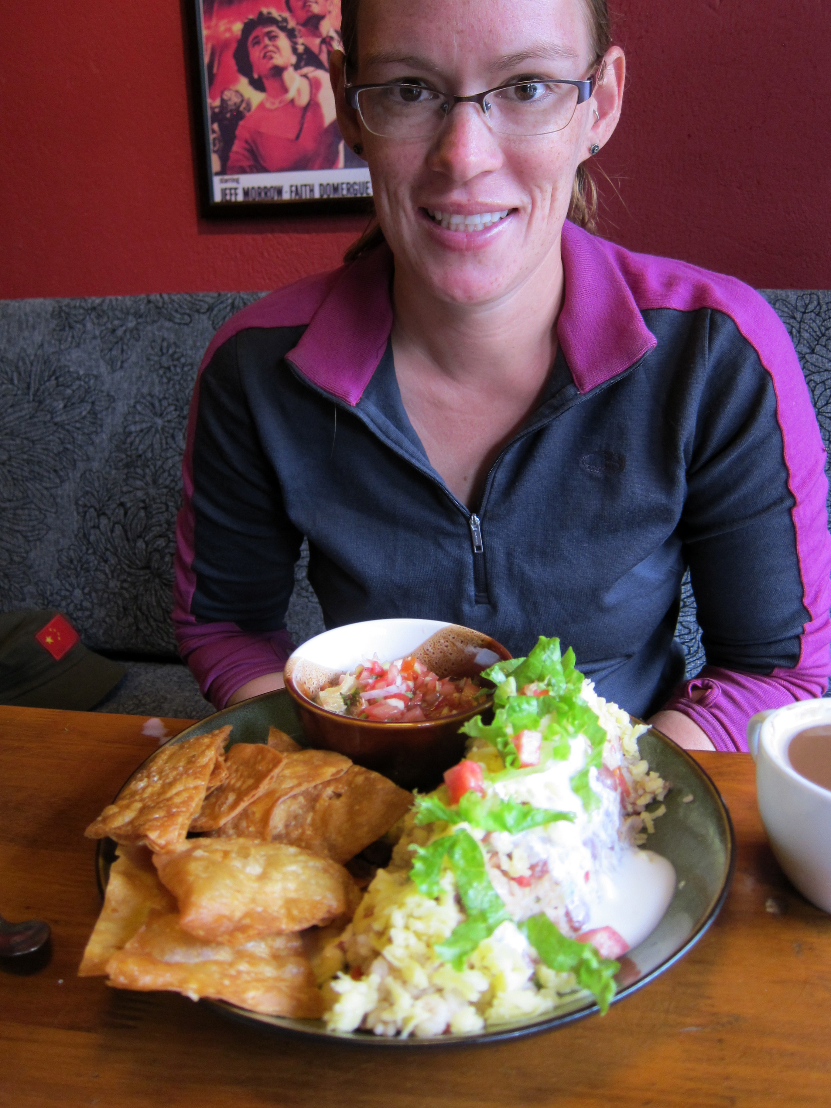 We had a victory feast of triangle cheese, crackers, dry ramen and bananas with chocolate and peanut butter when we reached the top. We had just completed our biggest pass to date and were ready for a relaxing downhill. Downhill we went, but it was anything but relaxing. The road was in awful condition, covered in potholes, cracks and poorly repaired potholes. It was more comfortable to stand up than sit down through the jarring ride. I was just as tired when we finally reached smooth pavement after standing up for 20km as I was when we finally finished the climb.