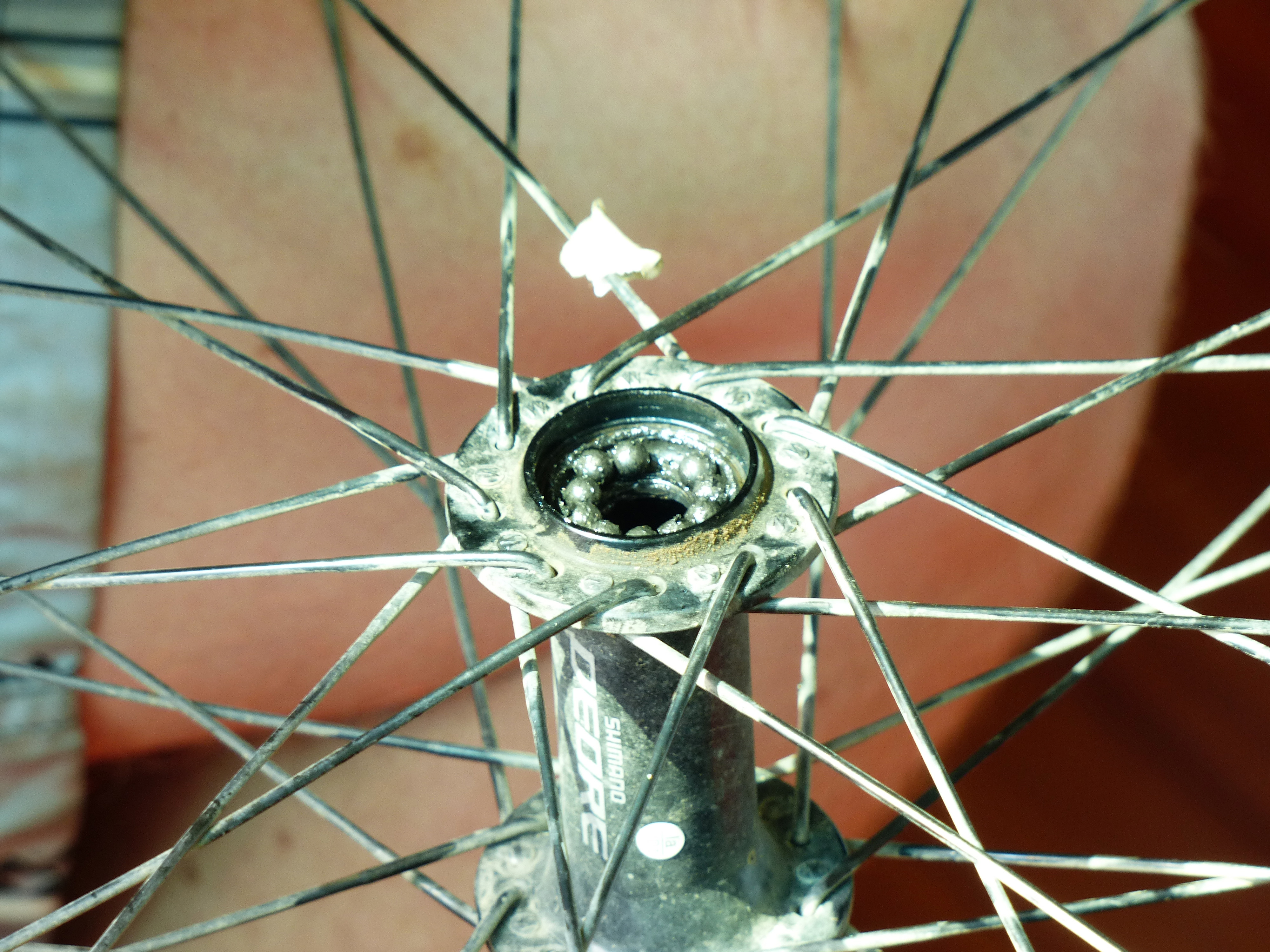 After our luck with the stove, he decided to tackle another problem. His front wheel had been making some noise so Chan took apart the front hub and found some grit had made it through the seals and trashed to bearings inside. Armed with the words “ball bearings” written in Chinese thanks to Google, he made the rounds through the industrial area stopping at all the motorcycle repair shacks. Motorcycle bearings don’t use ball bearings, so he struck out there. Finally, he found a few bicycle shops but the owners were absolutely clueless about ball bearings despite Chandler’s intricately drawn section views of a bicycle hub. All the bikes in the shops were absolute crap and the owners didn’t seem to know anything about them except maybe how to bolt the wheels on. Frustrated, he was finally able to find of all places at a fishing rod store (fishing reels use ball bearings) that also appeared to repair bikes. He was able to get a handful of used ball bearings a size too big, but they were better than the shattered ones rattling around in his hub and would hopefully limp his bike to Dali without causing too much harm.