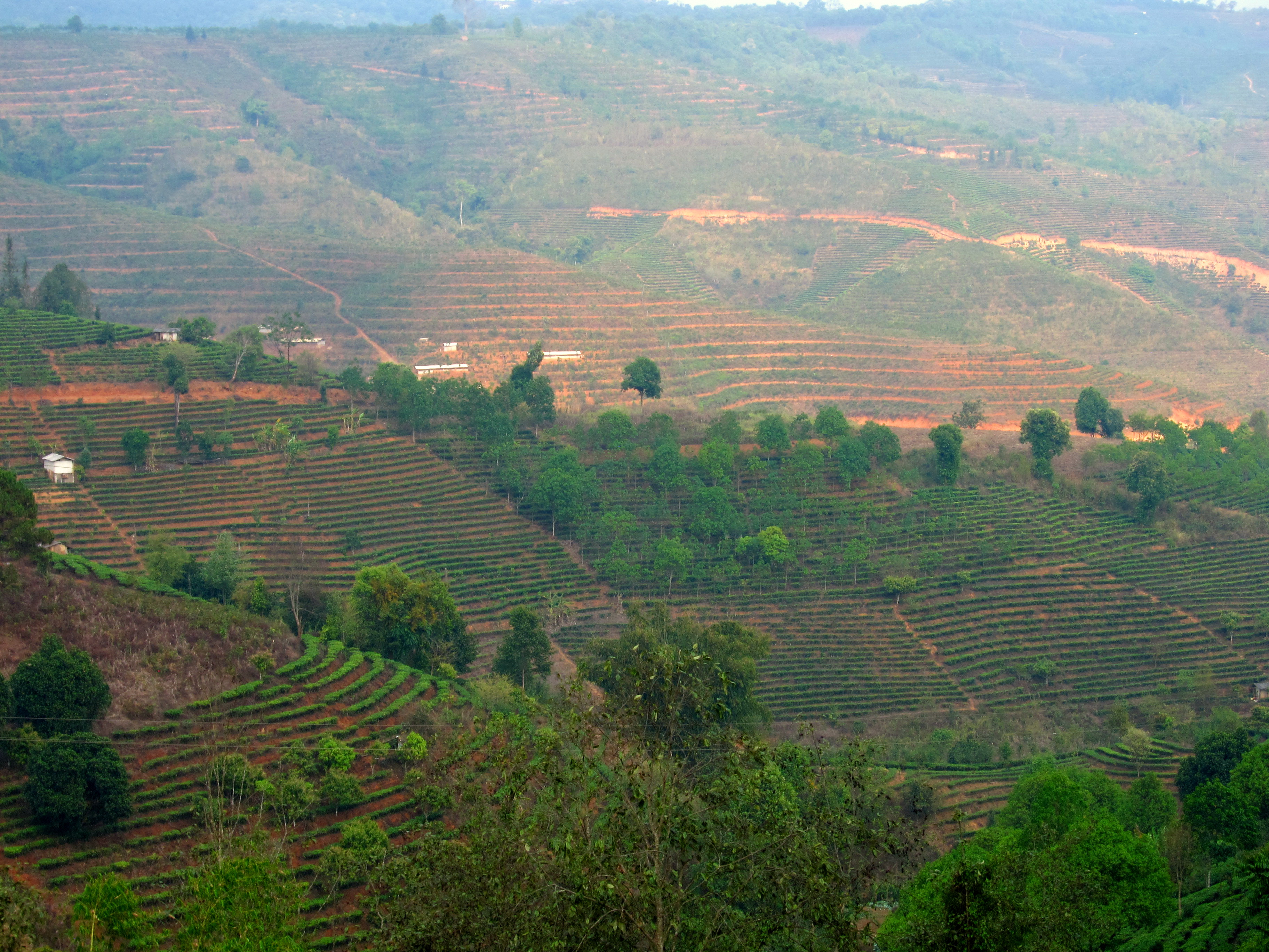 There was lots more grinding away but eventually we crested the pass and saw a family out picking tea in their fields. Chan stopped and talked with them a little bit while they worked. They were quite amused that we took an interest in what they were doing, and that we wanted to take their picture. As we were getting back on our bikes to head down the pass, a teenage girl who was working in the field crossed the road and we noticed that she was wearing 4 inch high-heels. In China, heels are apparently appropriate for any occasion.