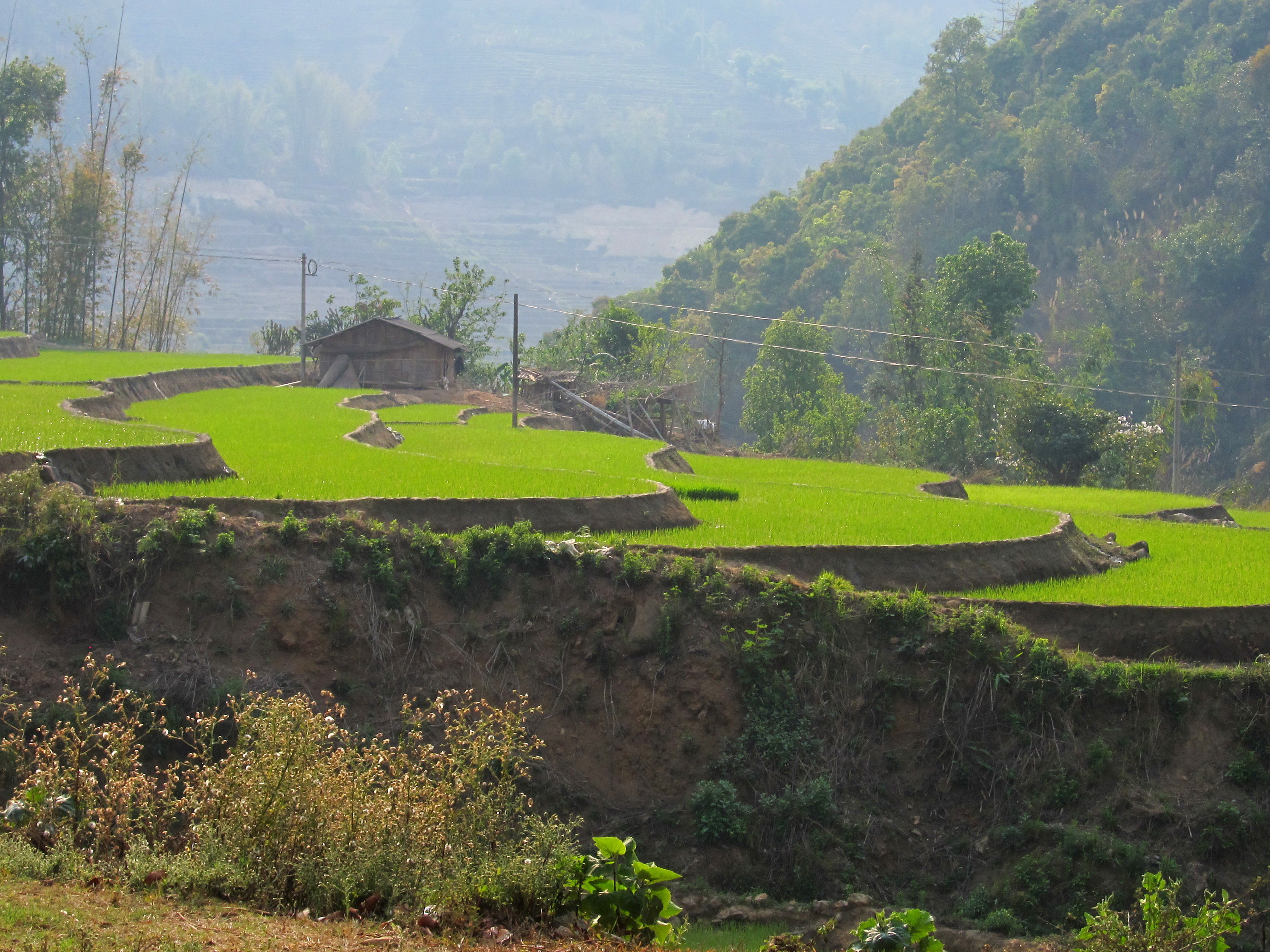 We buzzed down through the valley and saw tons of really stunning rice terraces, some vibrant green. The sun was at the perfect angle to be in your eyes but not be blazing hot. That’s when I saw it. The sign. Something in Chinese and 17km. I knew that this meant the hill we were about to climb would be 17 km of torture. We climbed about a kilometer before I caught up to Chandler’s bike, parked next to a bridge but he was nowhere in sight. A dirt road leading down a hill and presumably under the bridge veered off the road and I assumed this is where Chandler had disappeared to.