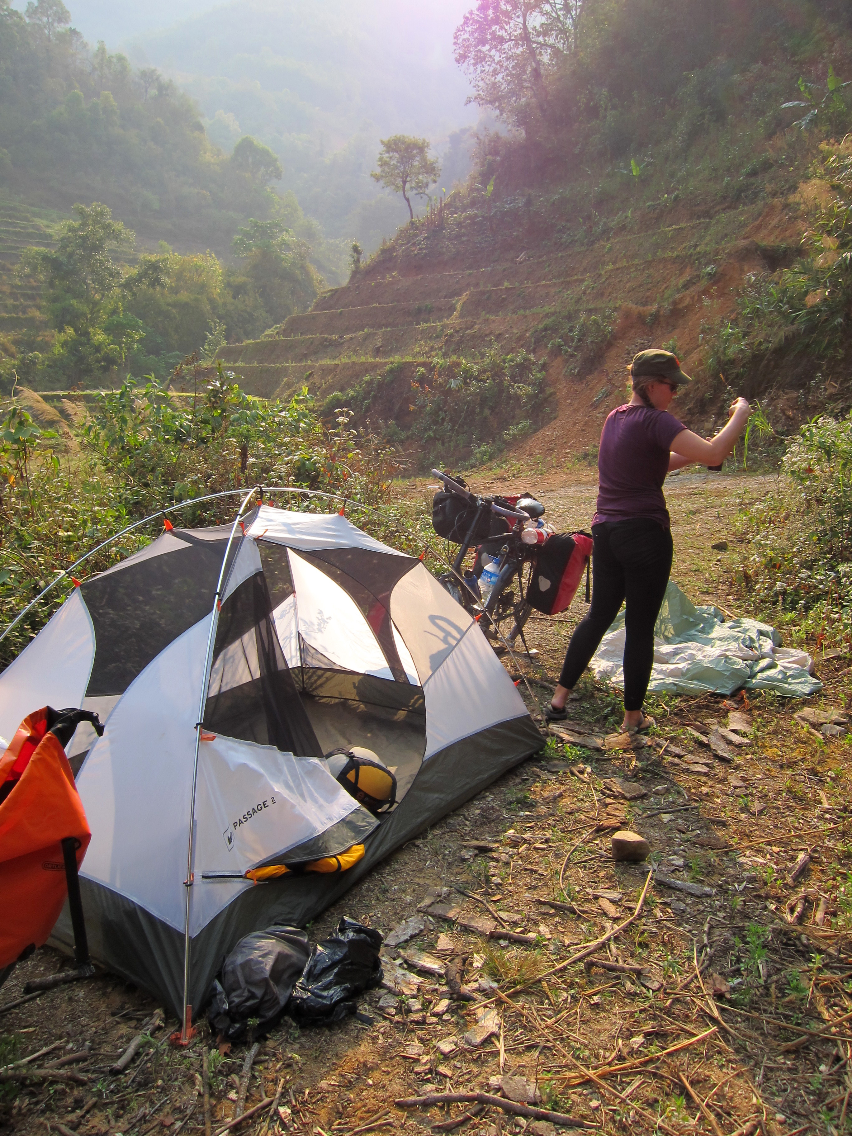 A few minutes later, Chandler appeared at the bottom of the hill and I knew he had found us a campsite. We checked out the other side of the bridge to see if there was a better option, but we didn’t see any. When there was a break in traffic, we pushed our bikes down the path to a small clearing near a stream and some rice paddles. We reasoned that we were on a segment of the old highway where it switched back to cross the stream with a short span, but the bridge was gone and there were huge boulders blocking the road from cars and trucks. We picked out our campsite on the flattest area where we could only be seen from the midpoint of the span of the new bridge.