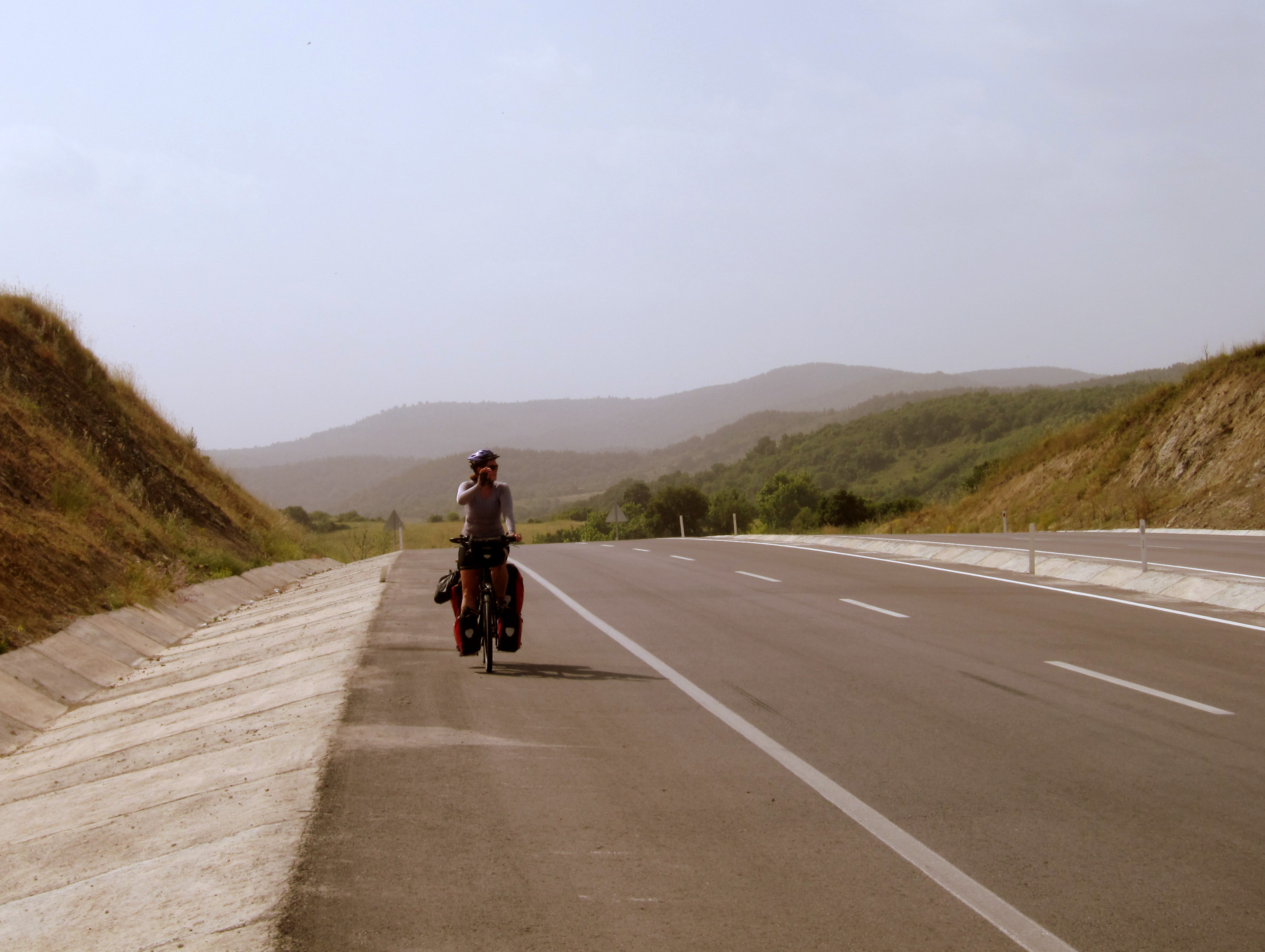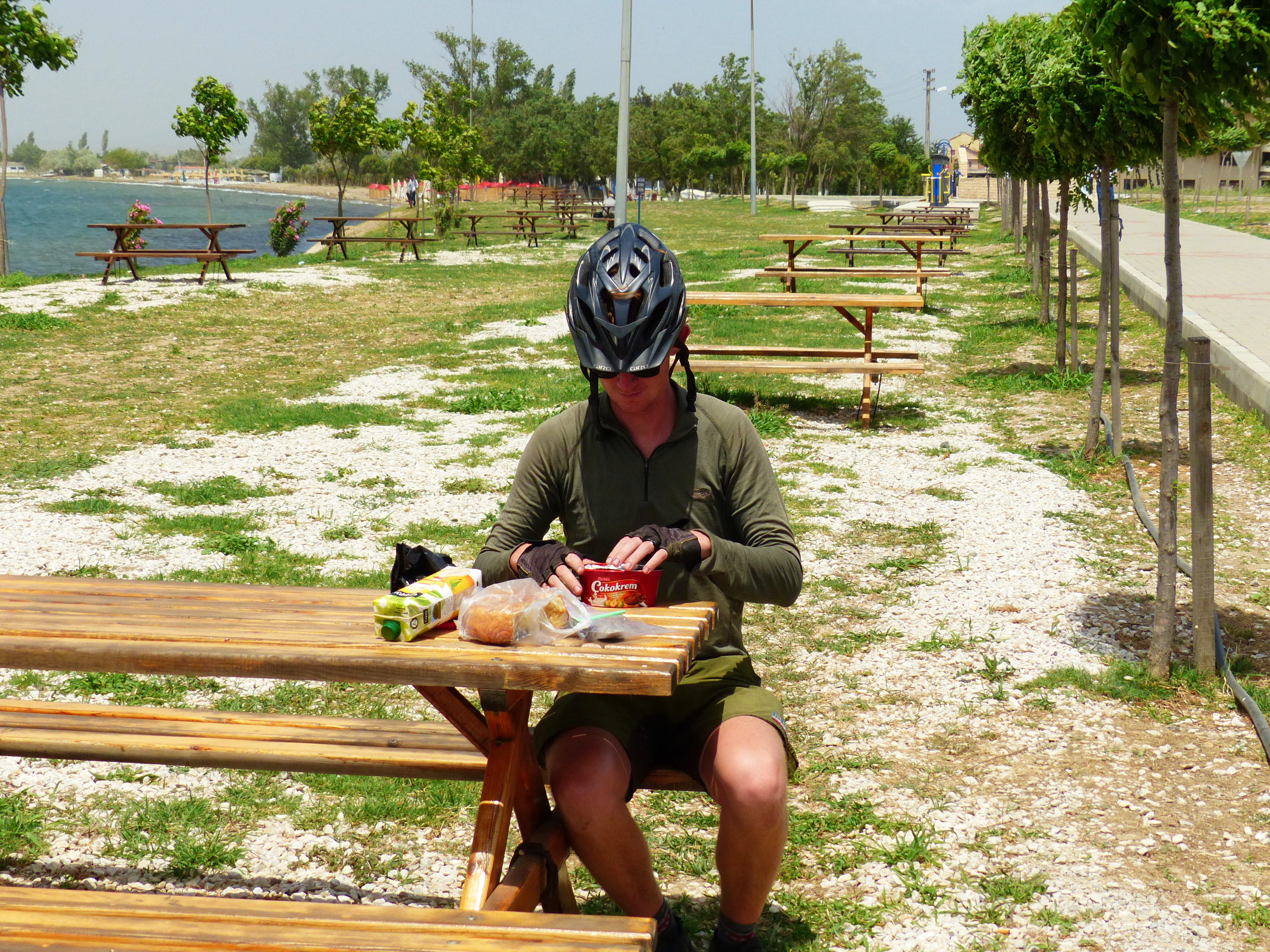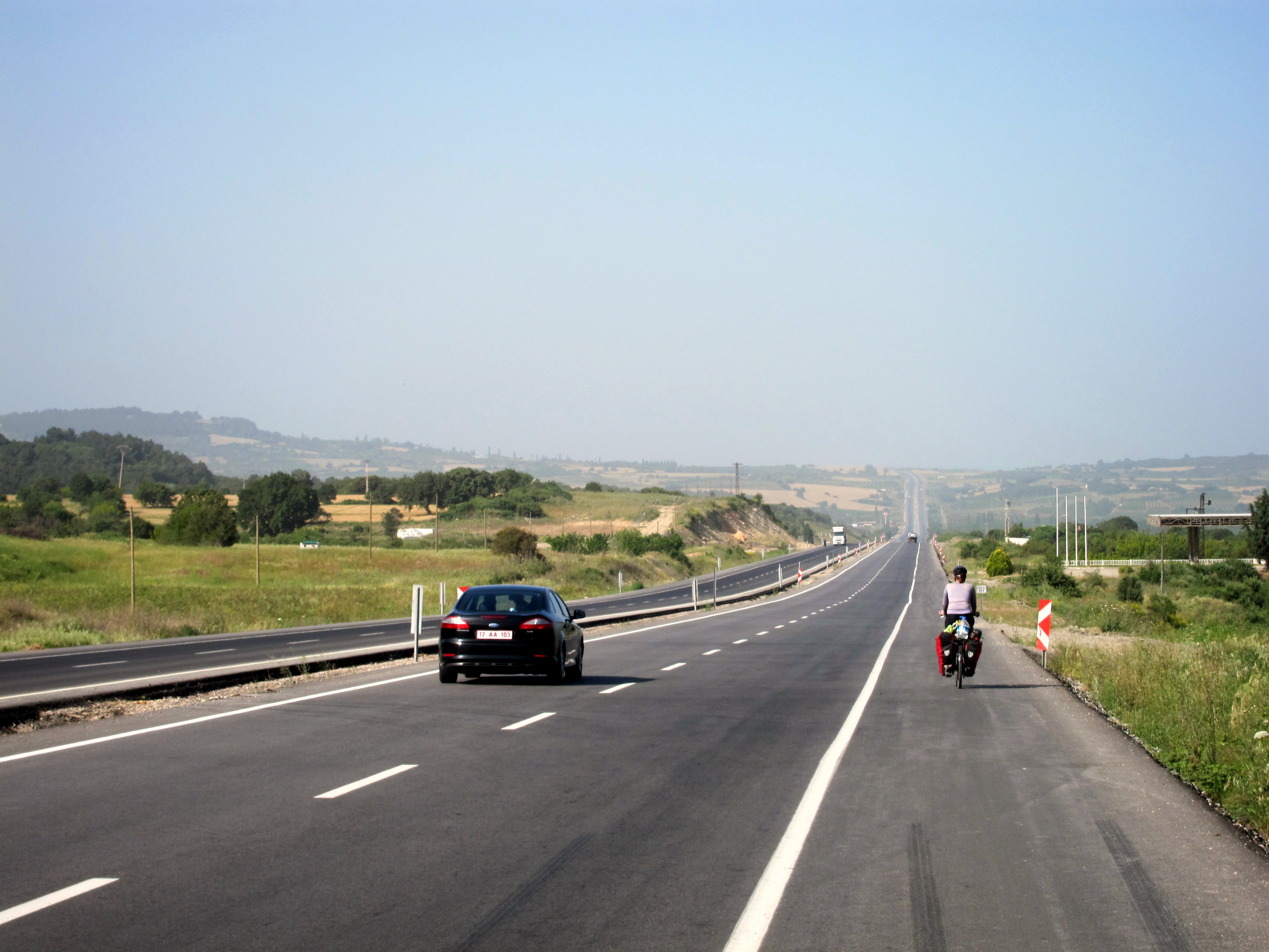 The road immediately headed straight up a big hill. We took it slow with lots of stops for water or juice. A young man in a dump truck actually offered me a ride up the hill by holding to his truck. I had to decline because I was too scared of what could possibly go wrong. At the top of the hill, we were rewarded with an amazing view of the Dardanelles.