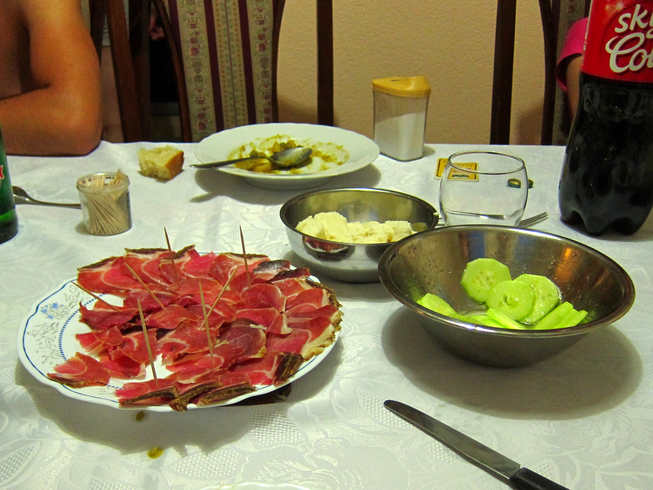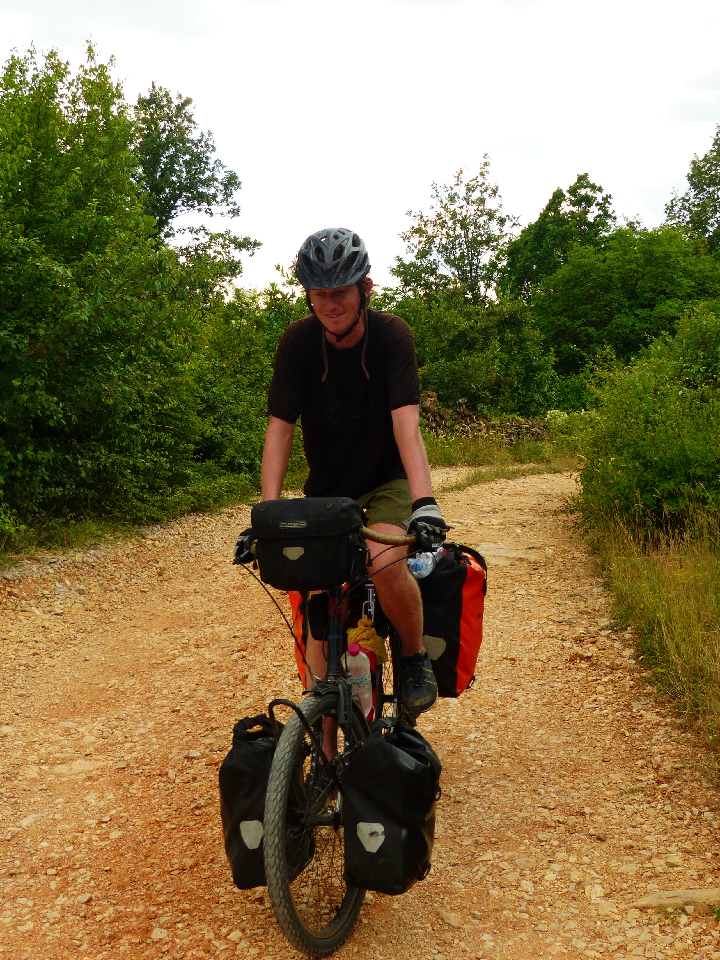 Right outside of town, I notice the perfect place. A pasture surrounded by trees. This would give us protection from the rain and lightening and hide us from any people passing by. We managed to find an area without animal poo or plants with sharp thorns. Right as we began to set up the tent, it began to rain. We quickly finished the job and covered anything that couldn’t get wet and decided to have bread and cheese for dinner in the tent.