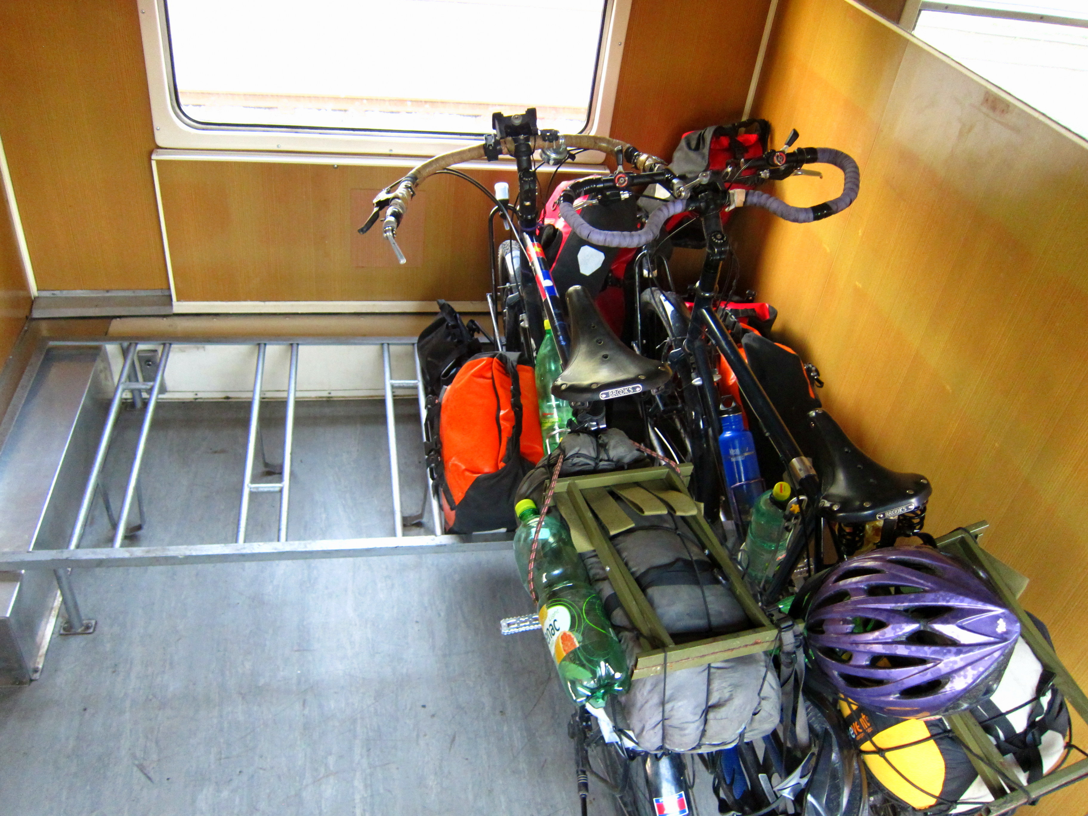 After dinner, we headed back to the train station to wait for our ride. When the train arrived, we put our bikes and panniers in the bike car and found a compartment for ourselves. The train was practically empty, so we had the place to ourselves and could stretch out and relax. We spent our time reading and napping.