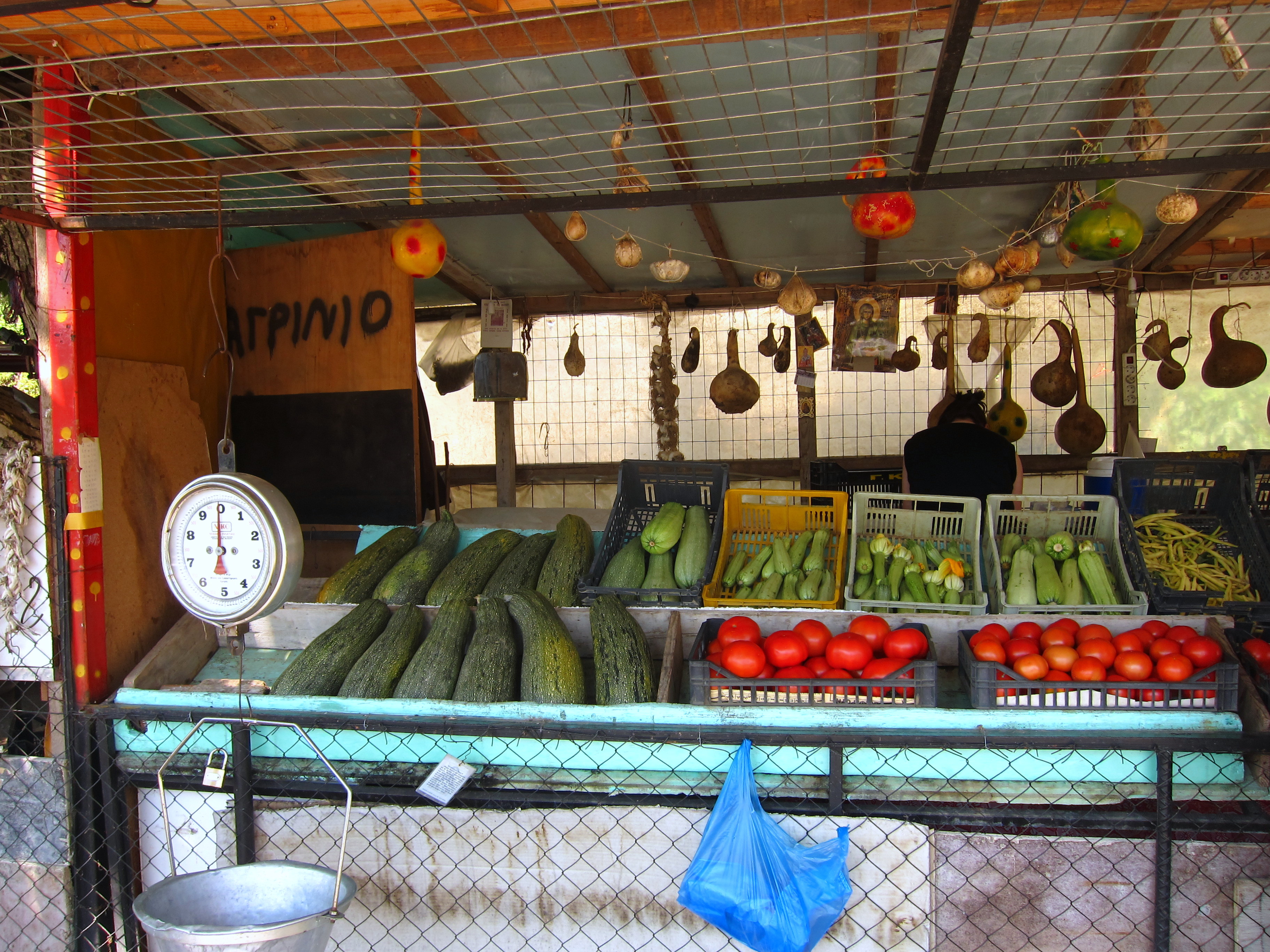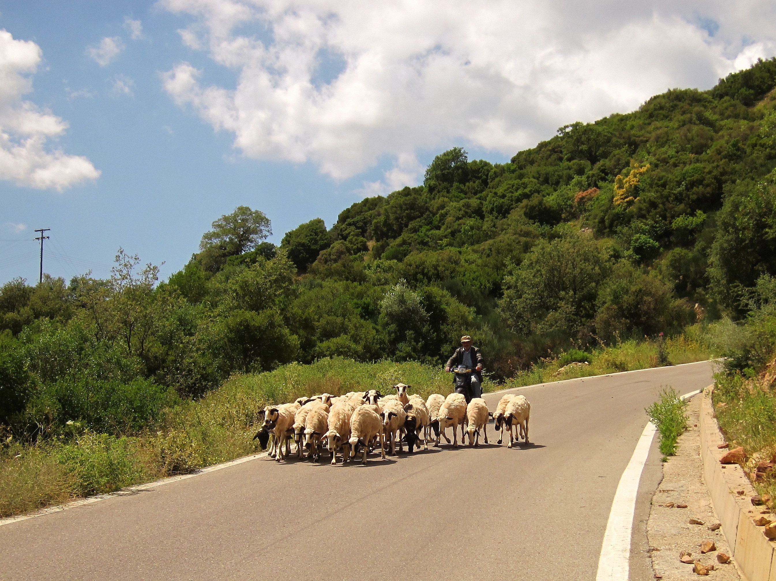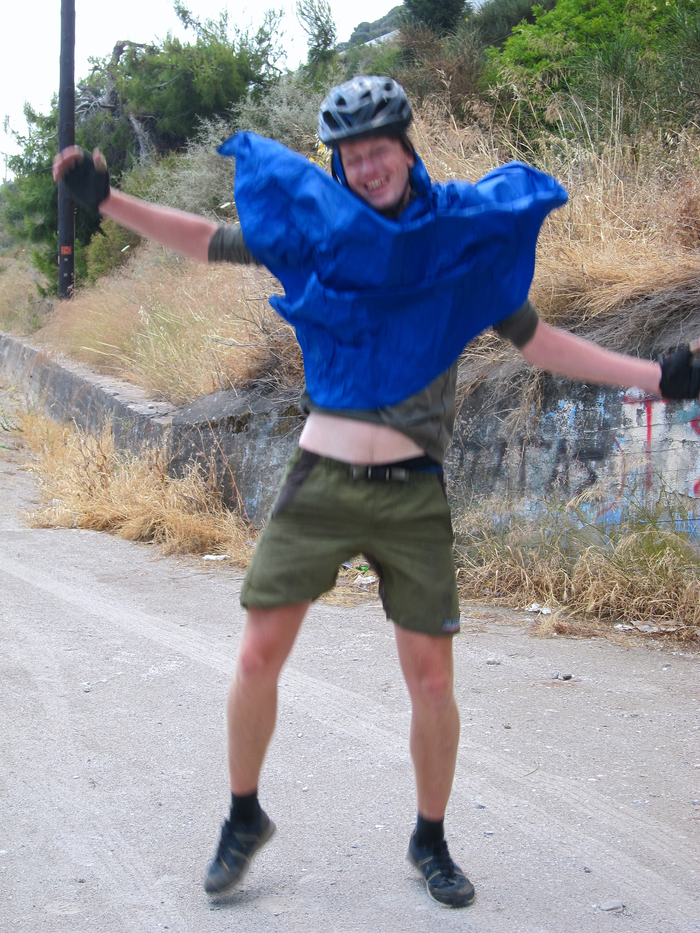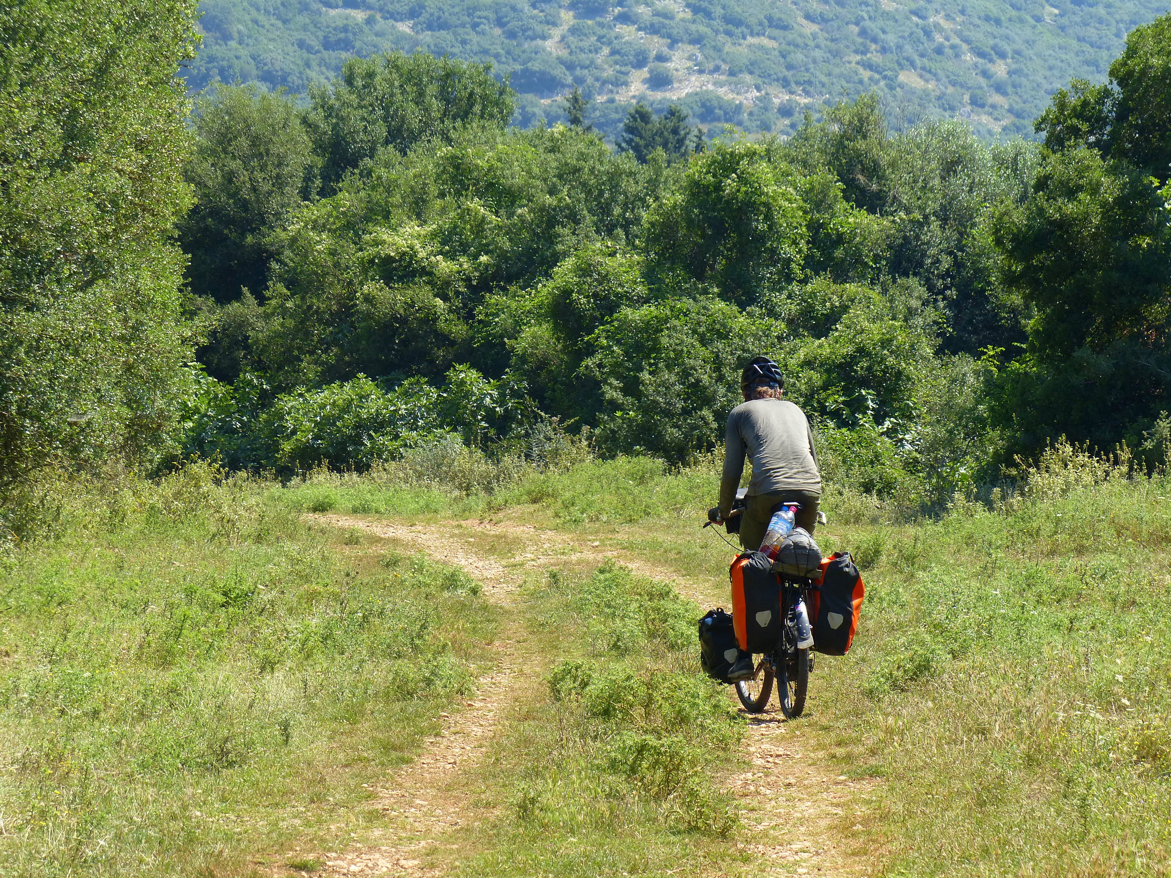 When we reached a larger village about 25 miles into the day, we stopped for cheese pies and to do some grocery shopping. Outside of the market, we meet our first bike tourist in Greece. He was a German who had been studying in Istanbul and was on his way to Vienna to return the bike he had borrowed. Cycle touring is apparently really popular in Europe and we were expecting to meet people on short tours, but he was the first cycle tourist we’ve come across since some Danish people in Turkey. He was pretty cynical about our GPS, and though it has sent us on some wild goose chases, it has been the most indispensable items we’ve taken along besides the bikes themselves . Paper maps can be great especially if they have topographic info, but they vary a lot in quality: in China we couldn’t find anything even remotely accurate, plus maps are expensive: $10-$15 per country adds up, and they don’t tell you where you are right now which is useful if you want to do some creative routing to escape an evil highway etc.