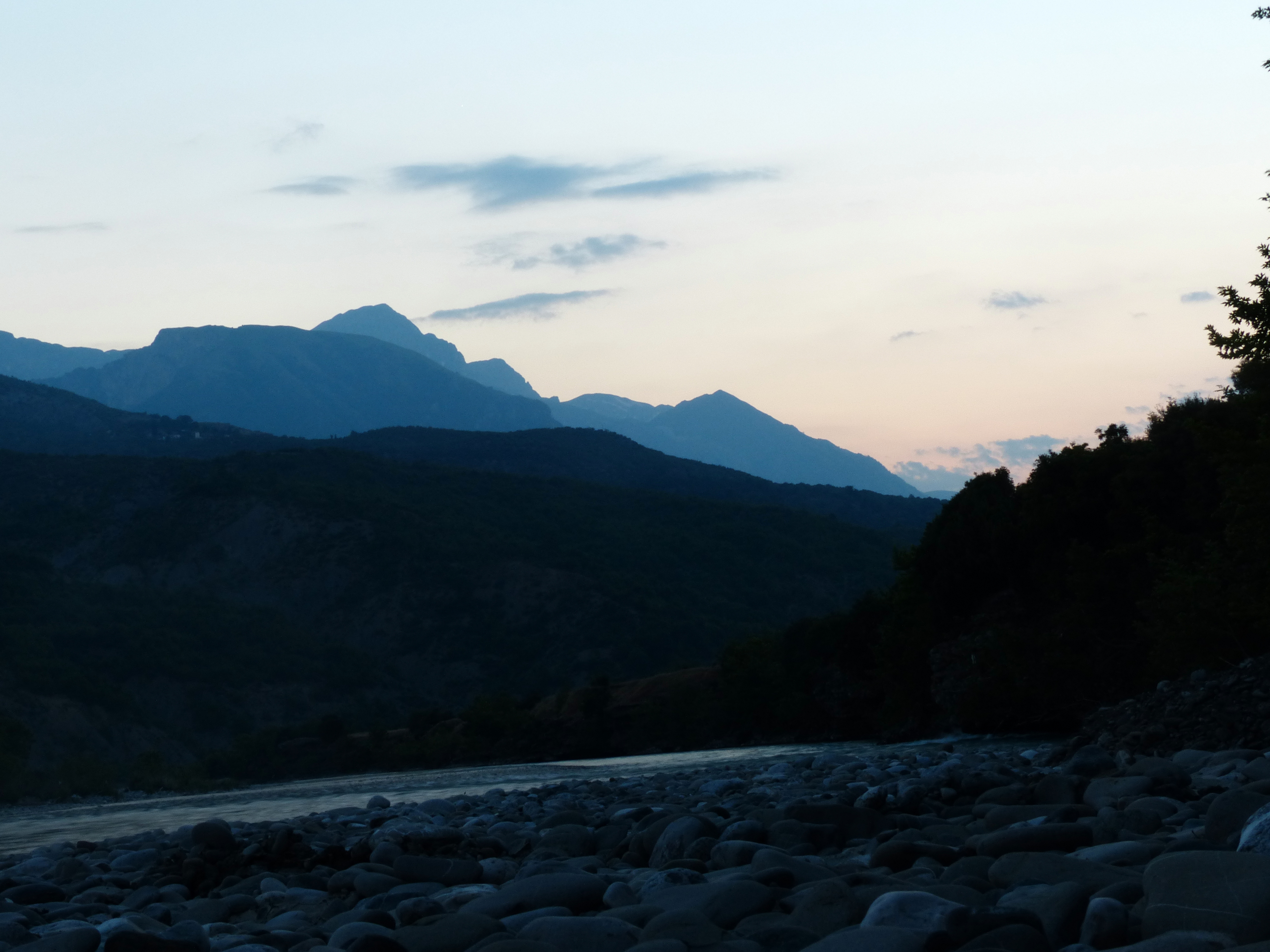 We set up our tent away from the river, next to a concrete wall on top of sand. We had a few sheep dogs come down and bark at us, but otherwise the night was calm and quiet. We were excited for our first full day in Albania.