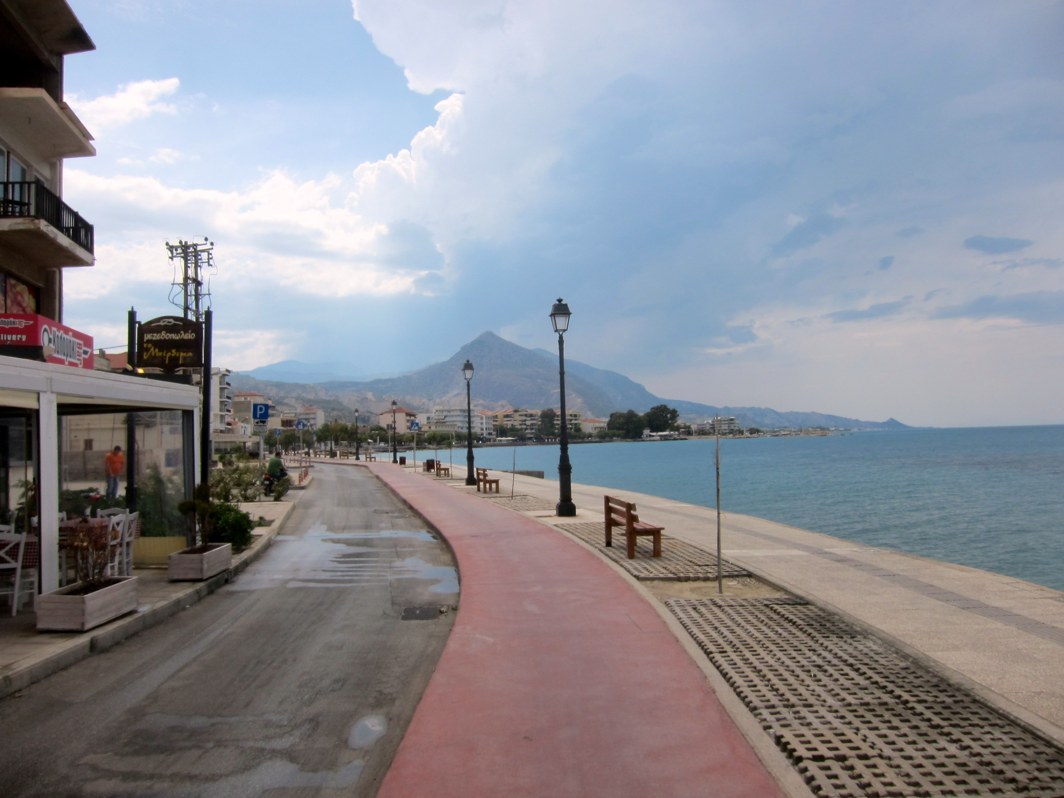 The part of Corinth we rode through didn’t compel us to stop, so on we went. We had a nice tail wind and the north shore was pretty, winding along right next to the ocean. The highway was really bad for riding, with lots of trucks and people driving with the sprite of want to be F1 drivers, so we spent a great deal of time consulting the GPS and riding on local roads that kept us on the water, but frustratingly repeatedly dumped us back on the highway.