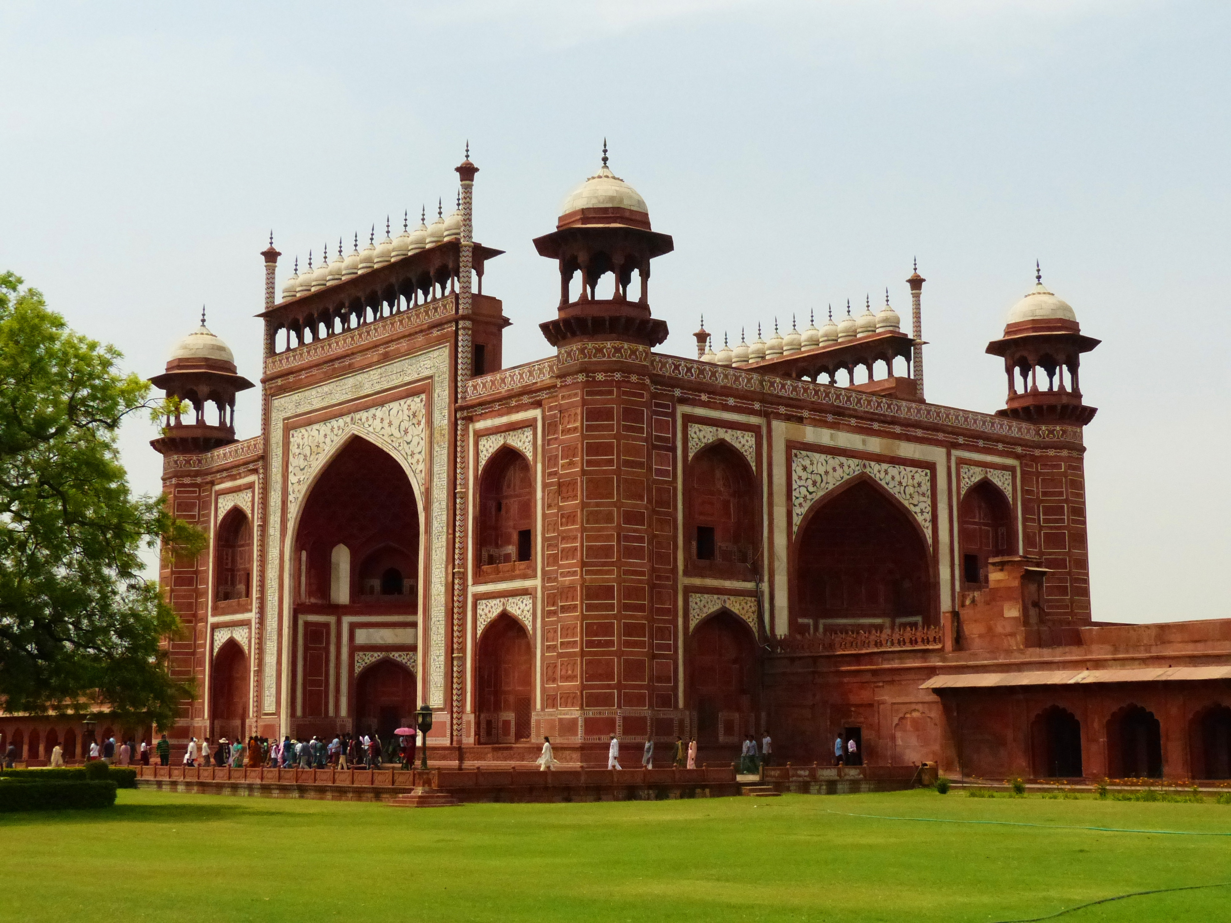Our first stop in Agra was the Taj Mahal. Hari had never been to see it either, so he was excited to visit as well. After buying tickets, we had to walk to the entrance and go through security which included the standard metal detector (which always went off) and pat down. We saw this sort of security everywhere people congregated in India, tourist attractions, malls, the metro even had soldiers behind sandbag bunkers with weapons pointed and ready. Now, we were in the outer courtyard of the Taj Mahal. There are three gates surrounding the Taj which were made of red stone and quite beautiful.