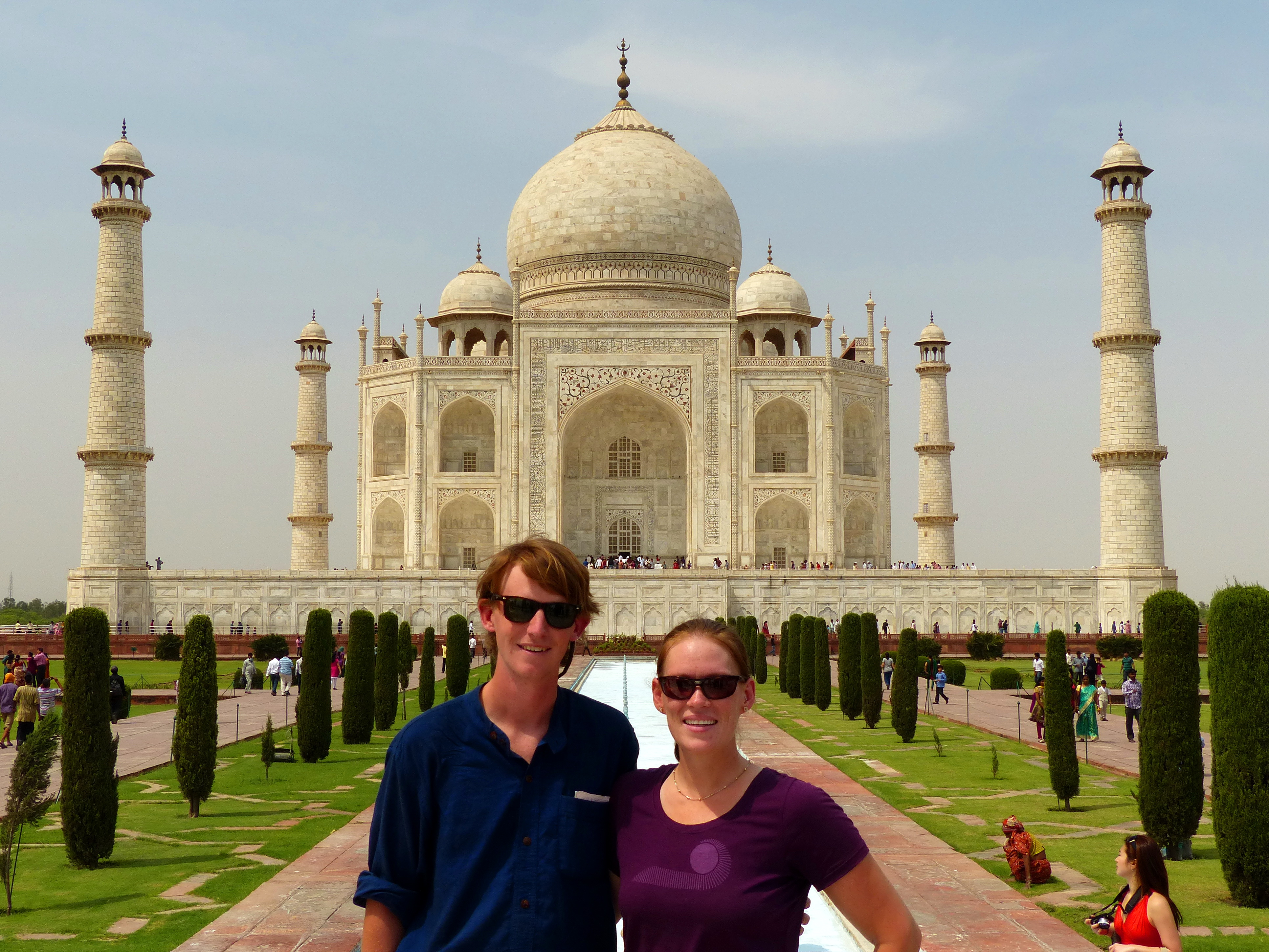 Pooja’s Dad had arranged for a car to pick us bright and early so we could get a good start to Agra. We had about a 4 hour drive and during that time we become completely convinced we did not want to bicycle in India. The traffic was crazier than anything we had ever seen, I was surprised we made it to Agra and back alive. Drivers swerved around each other, braking suddenly and horns blaring the entire time. Although the lanes were marked the traffic just used space as it was available, burgeoning into massive jams near traffic lights, which surprising broke up smoothly as everyone jockeyed forward when the lights changed. We actually saw a horse get hit by a guy and the front of his car including his windshield was destroyed. He continued driving. The shoulder was not safe from traffic either.