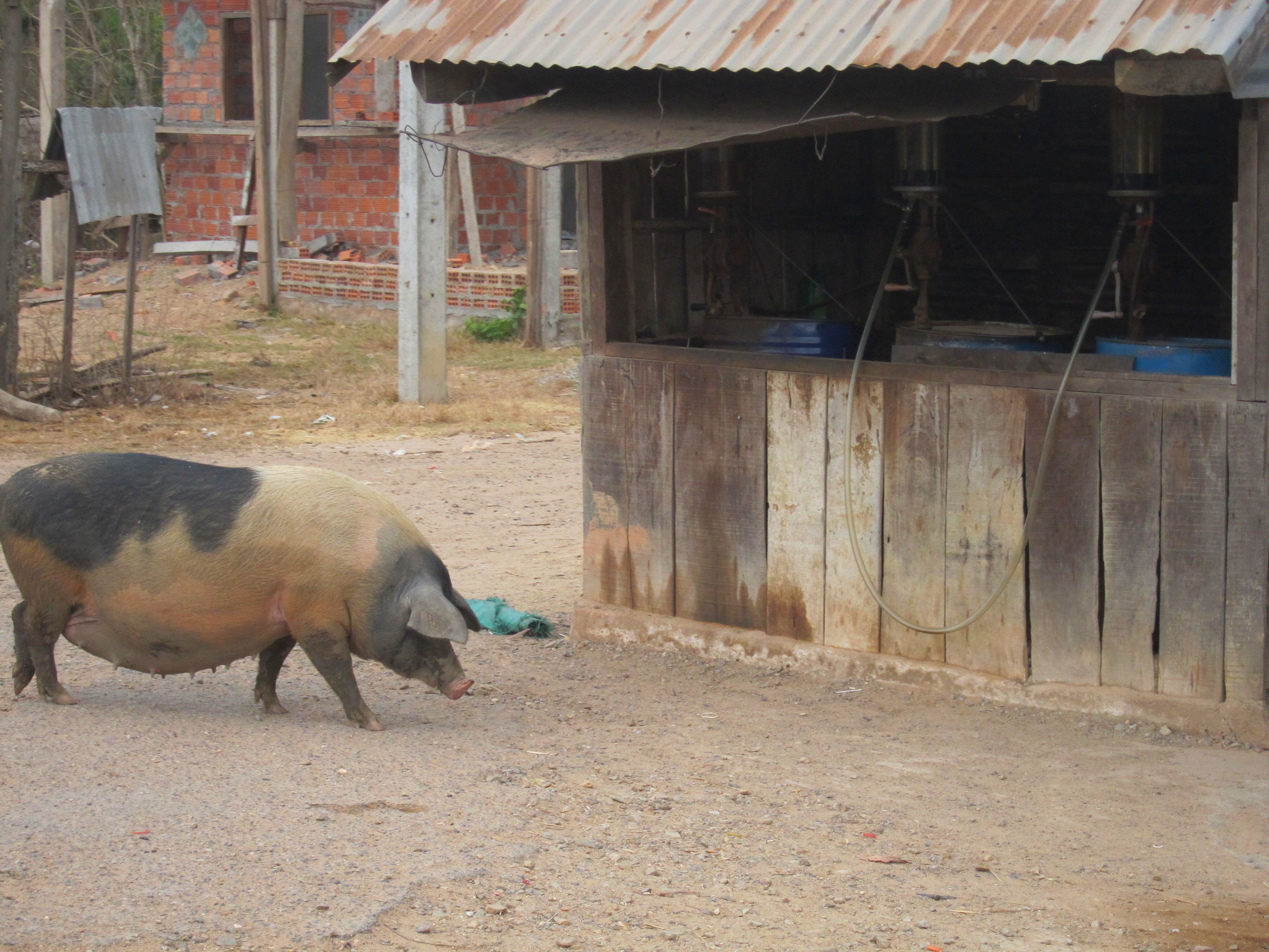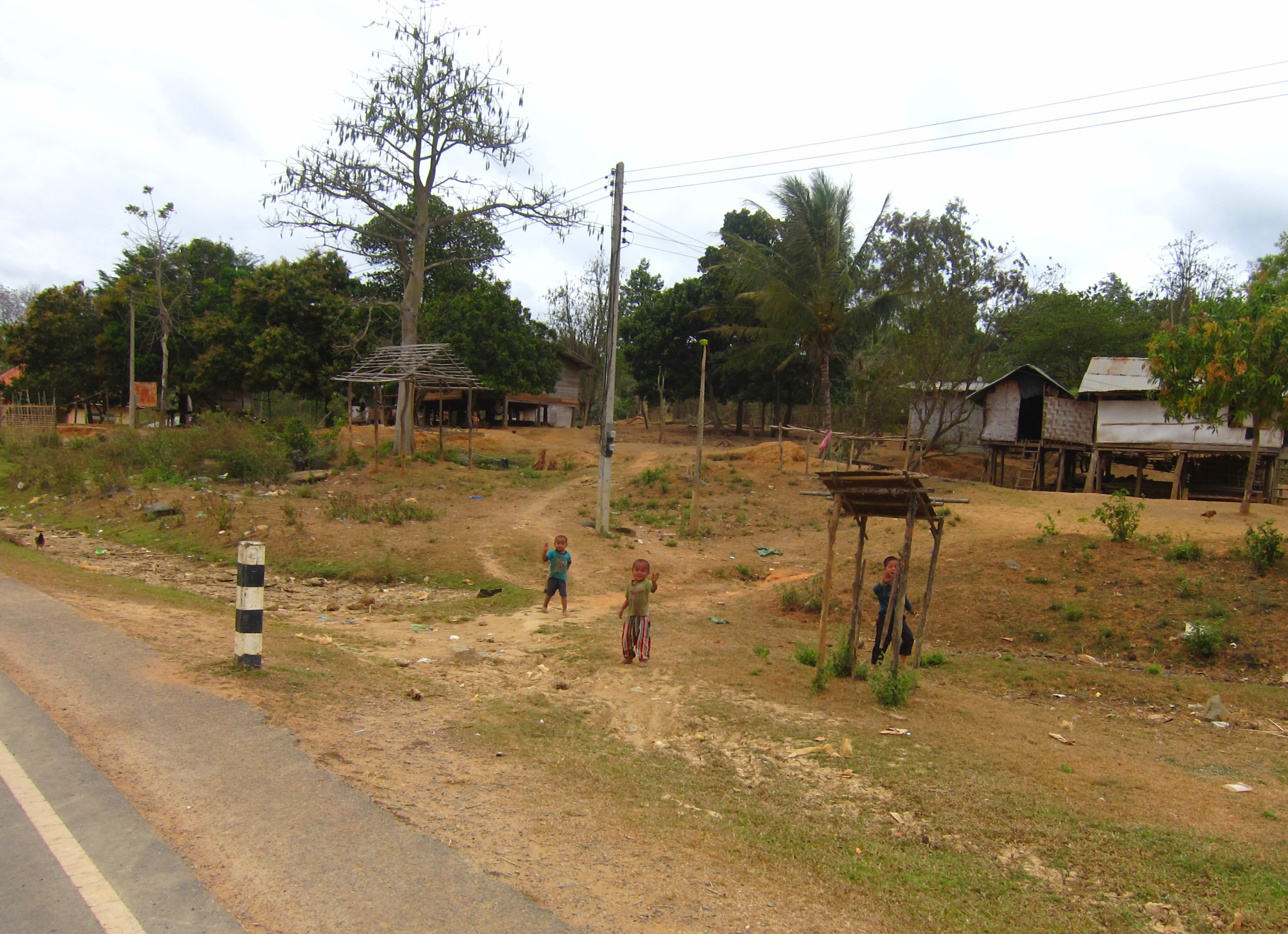 The ride was easy going, rolling hills with a tailwind. We were flying down and up every hill. The scenery was not as lush as Vietnam, but still mountainous and beautiful. Children and adults called out to say “Sabaidee” to us in each small village we passed. Laos is the first country that people mostly greet us in their own language, not in English. It is surprisingly refreshing. We saw lots of goats and pigs wandering on the side of the road and sometimes in the road. We passed through a village where everyone seemed to be making charcoal. Tractors piled with wood that smelled like cedar frequently passed us, delivering their loads to the villagers. We saw piles of smoldering sand where they had buried the burning wood slowly transforming it into charcoal. Villagers with black hands raked the sand away from the finished piles, and extracted the blackened remnants of the wood. The charcoal towns were full of dense sooty smog and were not all that pleasant for riding.