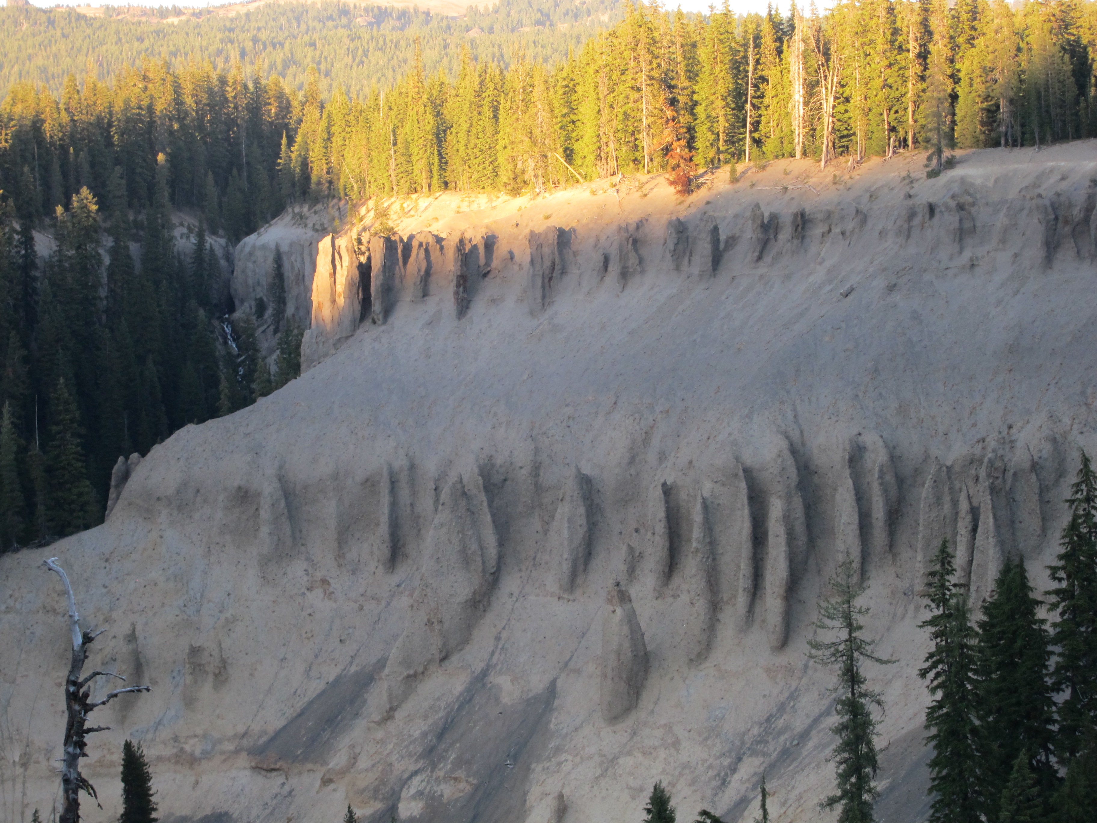 This was a very beautiful area to visit with really neat roadside geology. Here is a picture of some fumarole things. They were formed by gasses passing up through deep layers of glowing volcanic ash avalanches. Minerals in the gasses hardened columns within the debris which were then revealed after a creek eroded a channel and eventually a canyon through the volcanic material. I read that on an interpretive sign, so I’m kind of an expert.