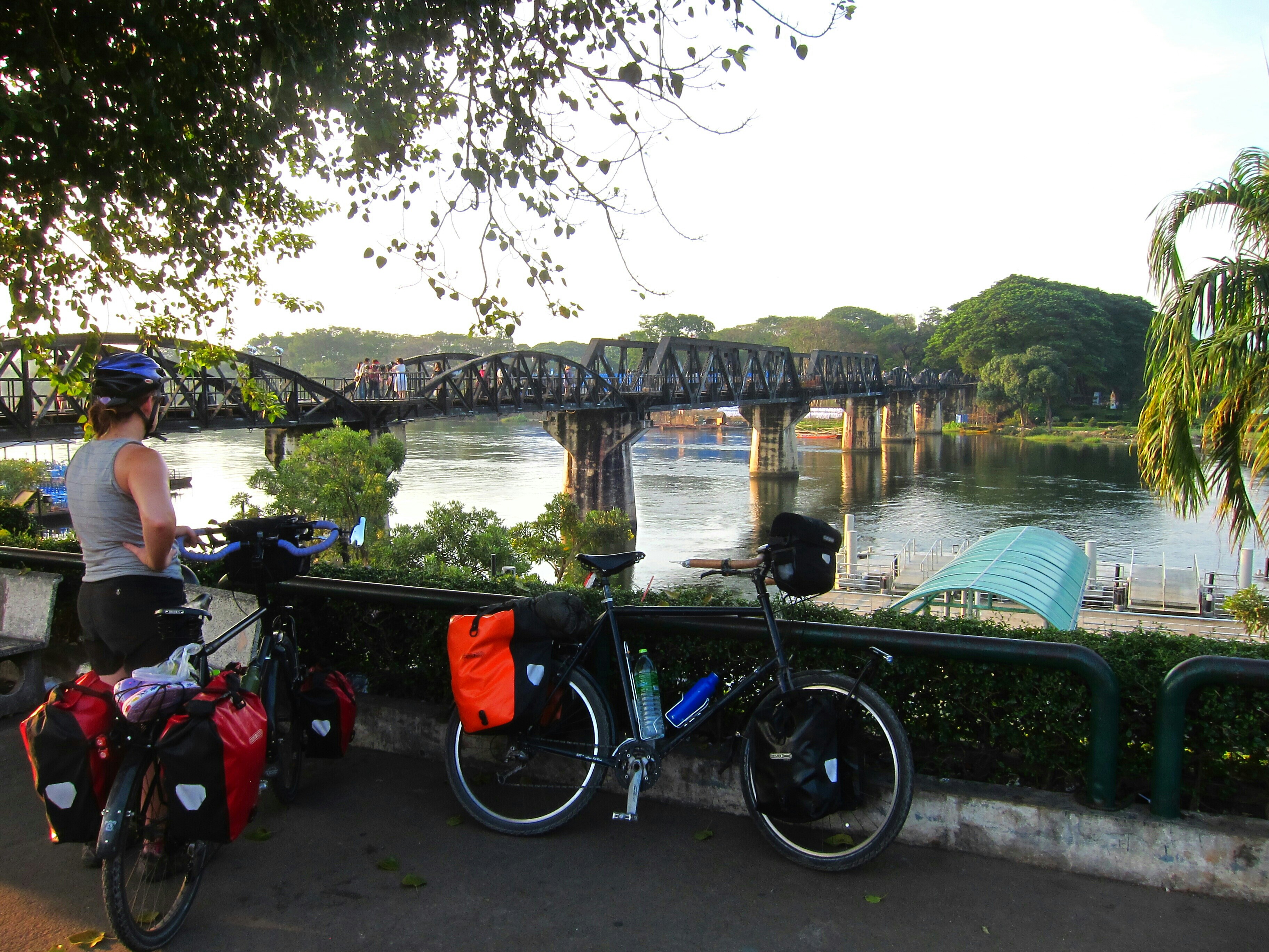 The bridge was the scene of an expensive “light and sound show” that night, which we skipped. We saw it the next morning as we were rolling out of town, but we were on our fully loaded bikes, so opted not to venture out on it (trains still actively use it). Our plan is to take the “death railway” on the way back from western Thailand, so we’ll ride across it then.