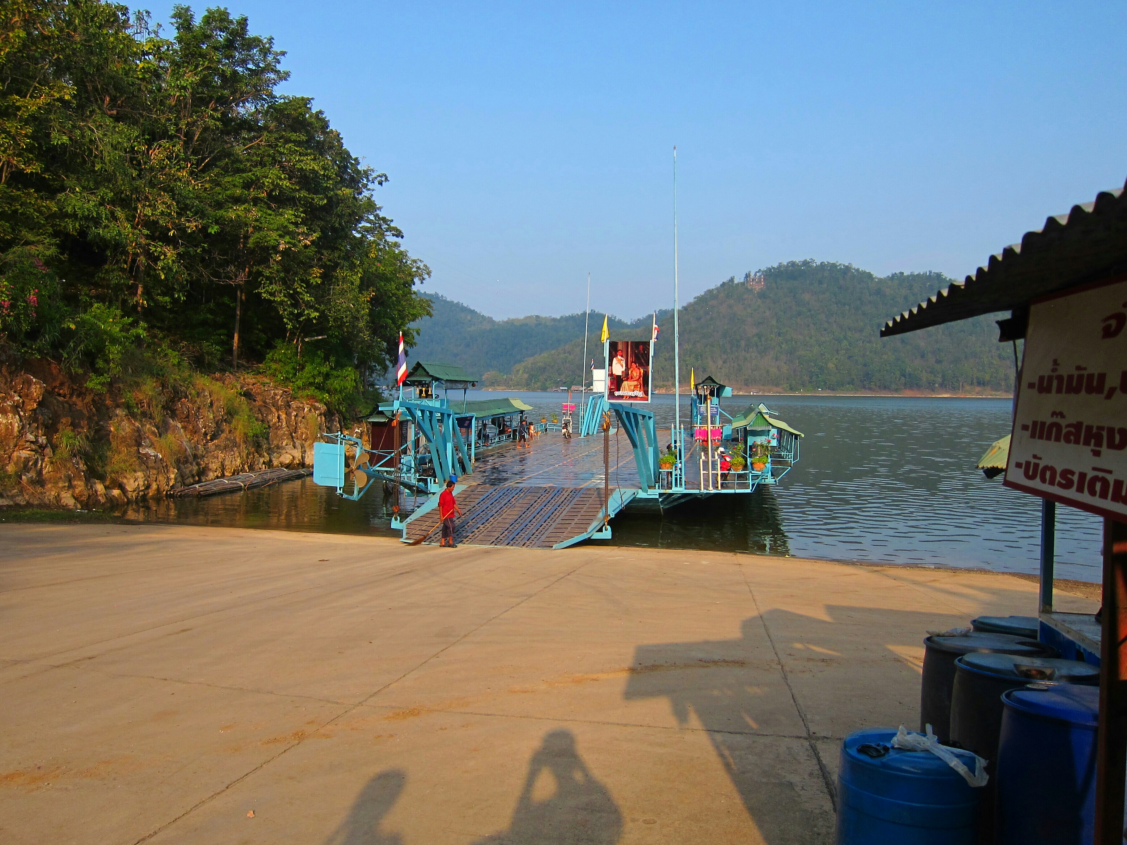 After a few more warm km of riding and a detour into the sleepy administrative town of Si Sawat, we made it to another ferry spur road. This ferry cuts across the width of the reservoir and is the only access to the western shore north of the dam.