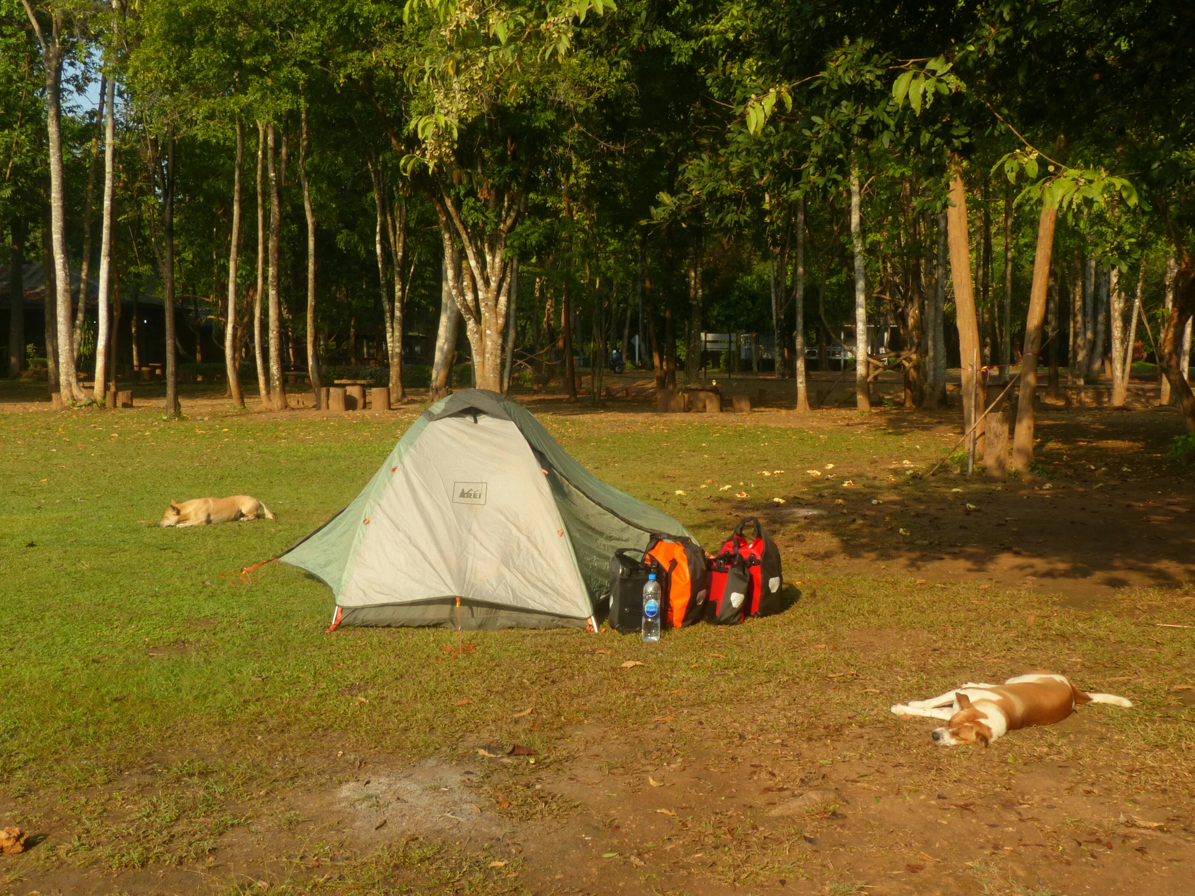 We paid our foreigner entrance fee of 200 baht each, rode up one final huge hill and pitched our tent in a huge grass field overlooking the reservoir, right next to the Mae Khumin waterfall. We went for a swim in one of the waterfall pools then had a basic, but very good dinner at the park restaurant (same prices as anywhere else, less than 100 baht for dinner for two). Then some rest.